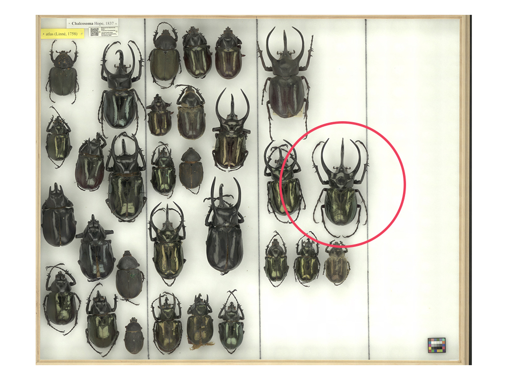 The Chalcosoma atlas beetles in the insect box scans served as the original inspiration for the project, in particular one gorgeous individual highlighted in the scan. -- CC BY / Museum für Naturkunde Berlin