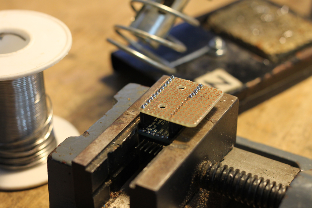 Perfboard being made for a mini-Arduino, trying to fit all the electronics into small space. -- CC BY / Kati Hyyppä