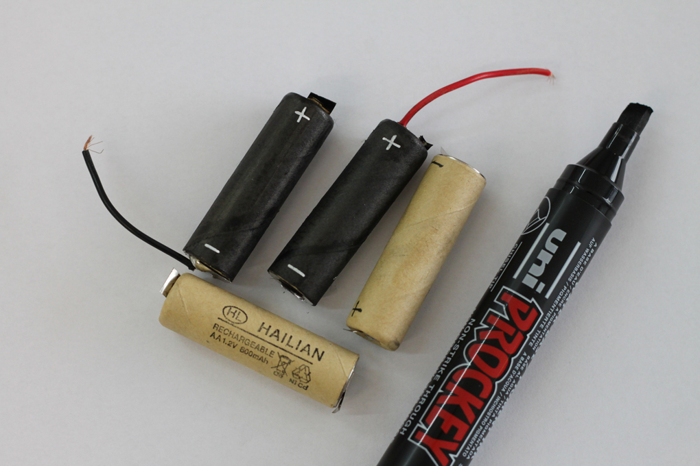 Chargeable batteries from a broken cordless drill became the life force of the Cyberbeetle. They were also given appropriate look and feel with a permanent pen. -- CC BY / Kati Hyyppä