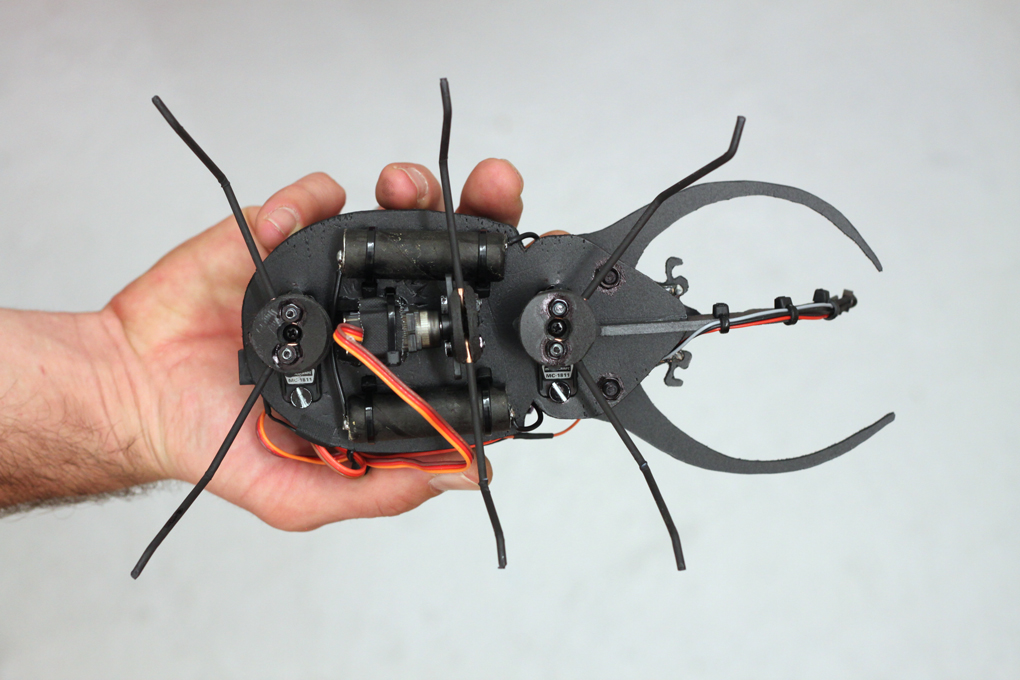 The beetle has three micro servos attached to his belly, one for each pair of legs. The crawling movement is achieved by tilting the body with the middle servo while the other servos turn and push the beetle forward. -- CC BY / Kati Hyyppä