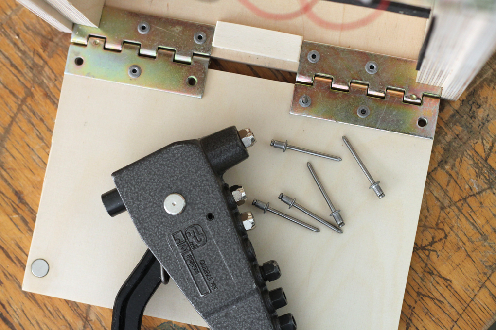 Attaching the hinges for the little doors in the bottom of the insect box. -- CC BY / Kati Hyyppä