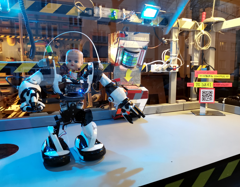 Transformation into a doll-head-cyborg who has a NodeMCU board on the chest. -- CC BY / Niklas Roy & Kati Hyyppä
