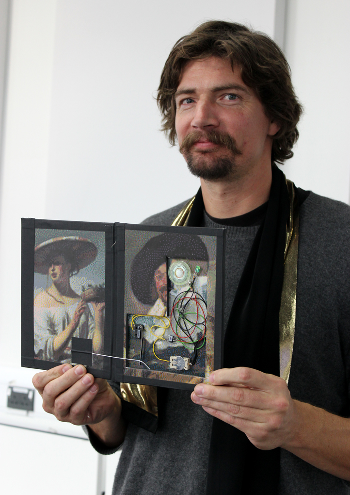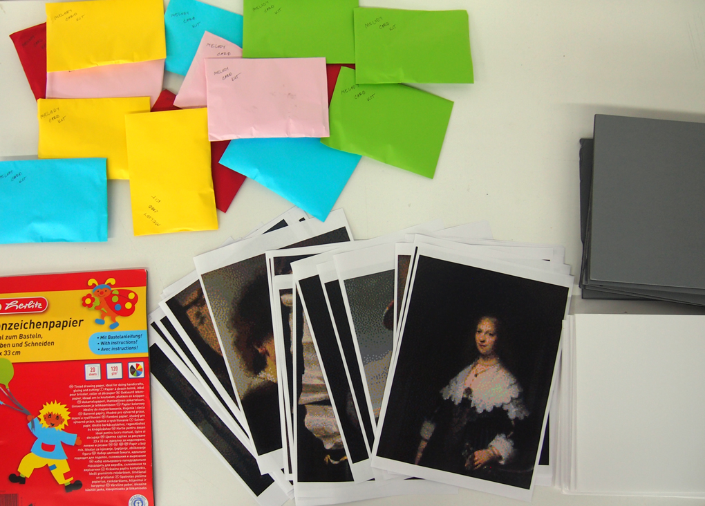 The main ingredients for the workshop included electronics kits in envelopes and pixelated prints of masterpiece paintings, which were made beforehand using Public Domain images from the Rijksmuseum. / CC BY Sanna Marttila & Neea Laakso