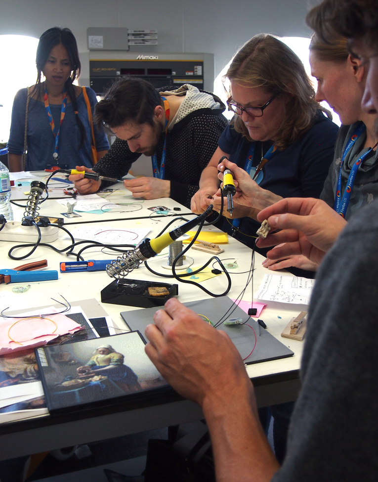 Soldering continued even the next morning after the workshop, as the dedicated 'Redesign Your Cultural Heritage' session organizers finished the couple of circuits that were not finalized during the workshop due to running out of time. Teamwork for the win! / CC BY Sanna Marttila & Neea Laakso