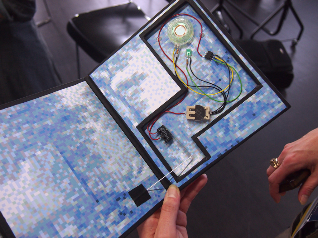 Sometimes it was easier to look at the example card for soldering aid instead of the schematic… Here you can also see how the switch was made: when opening the card, the piece of yarn attached to a microswitch lever is pulled, triggering the melody. / CC BY Sanna Marttila & Neea Laakso