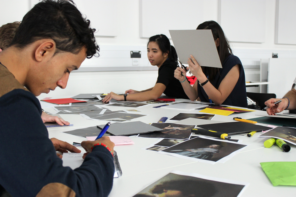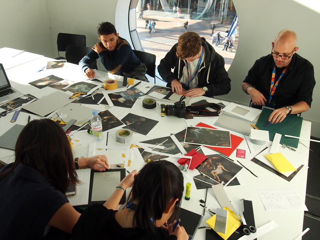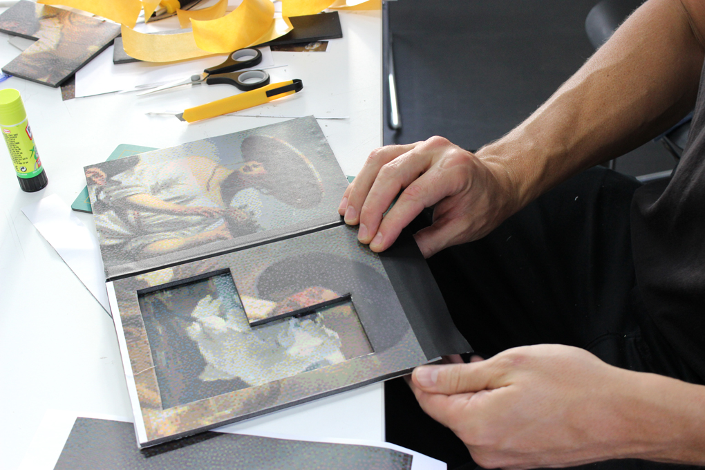 Selecting pixelated masterpiece prints. The prints were made beforehand because the workshop was short, but had we had more time, it would have been nice to let people make their own pixelated pictures. / CC BY Sanna Marttila & Neea Laakso