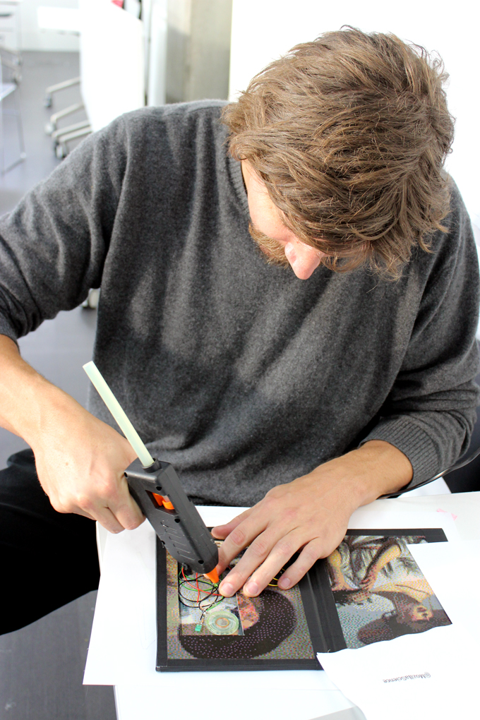 What would a DIY workshop be without hot glue? The electronics were attached to the card with this wonder substance. / CC BY Sanna Marttila & Neea Laakso