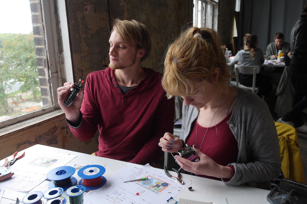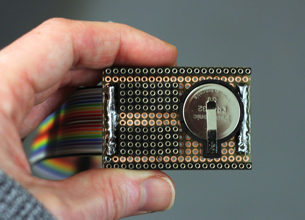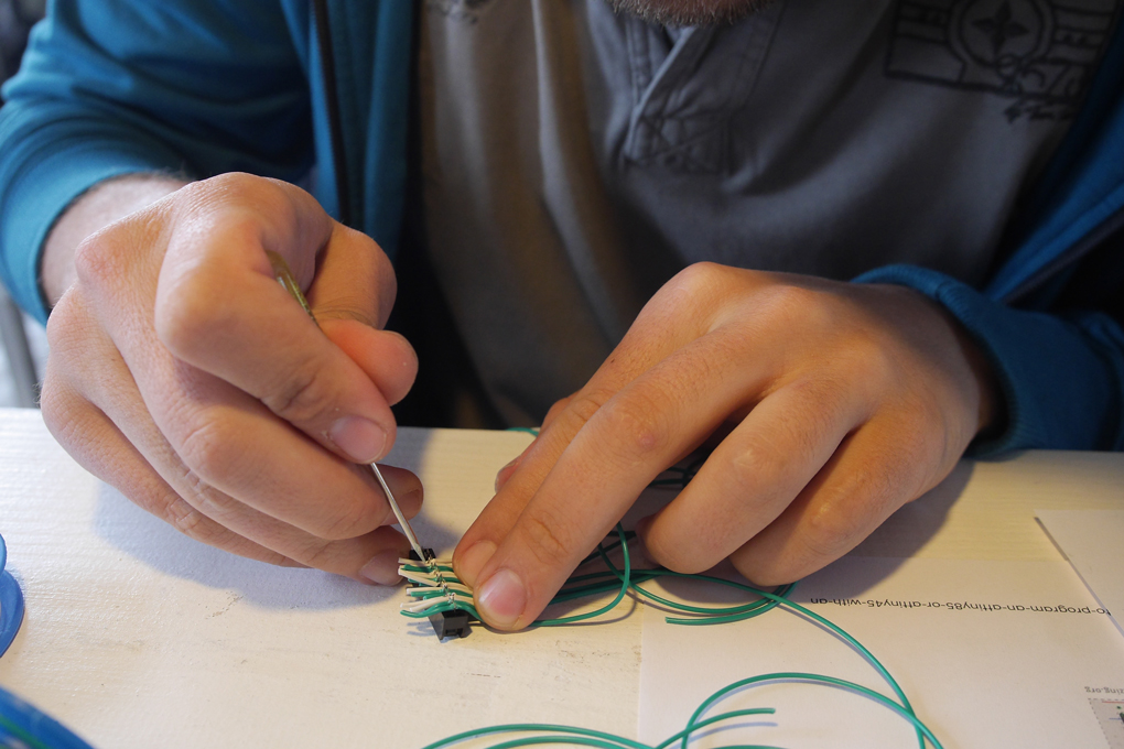 Finishing off the middle connections on the backside of the board. Here you can see also the male pinheaders on the sides, which were used for connecting the wristband/belt to the board. / CC BY Kati Hyyppä