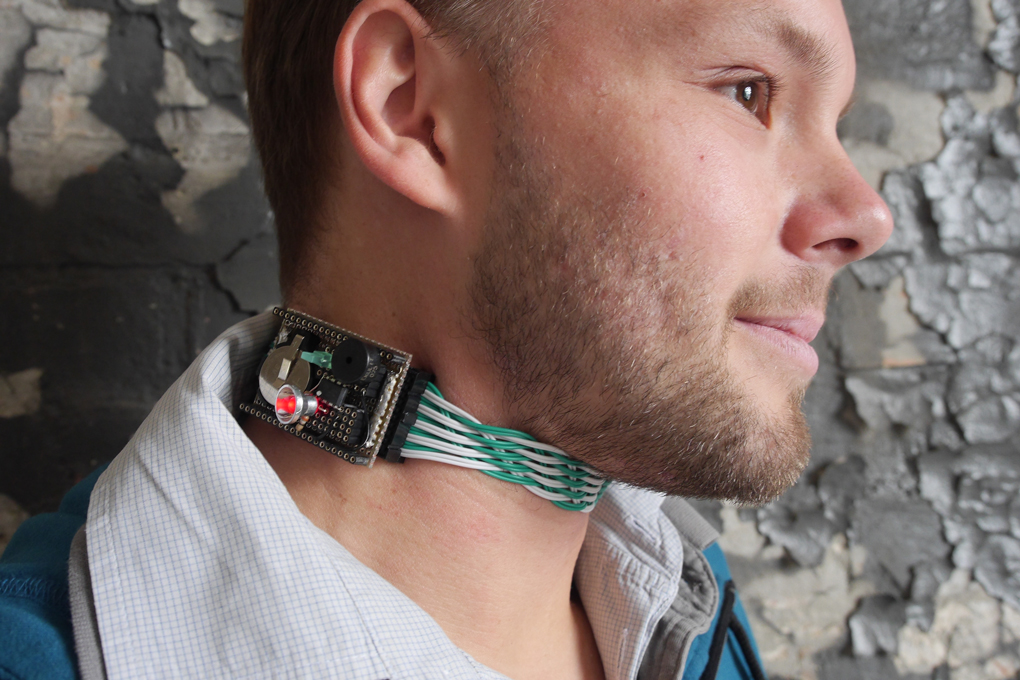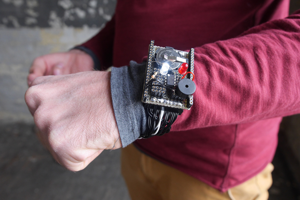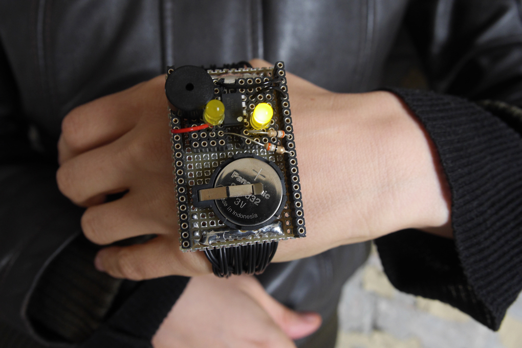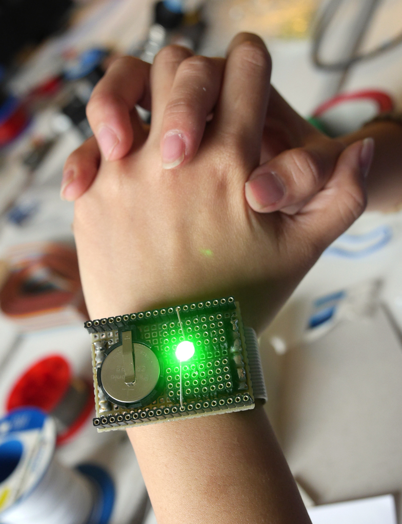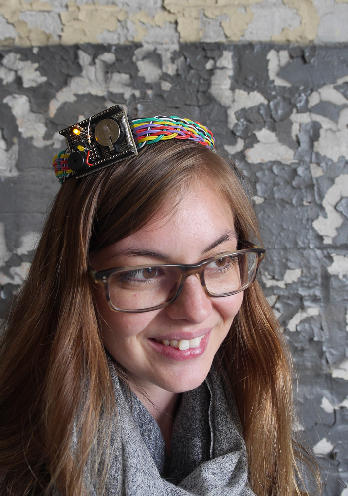 Not only can the breadboard be worn on the wrist, but also on the head. / CC BY Kati Hyyppä