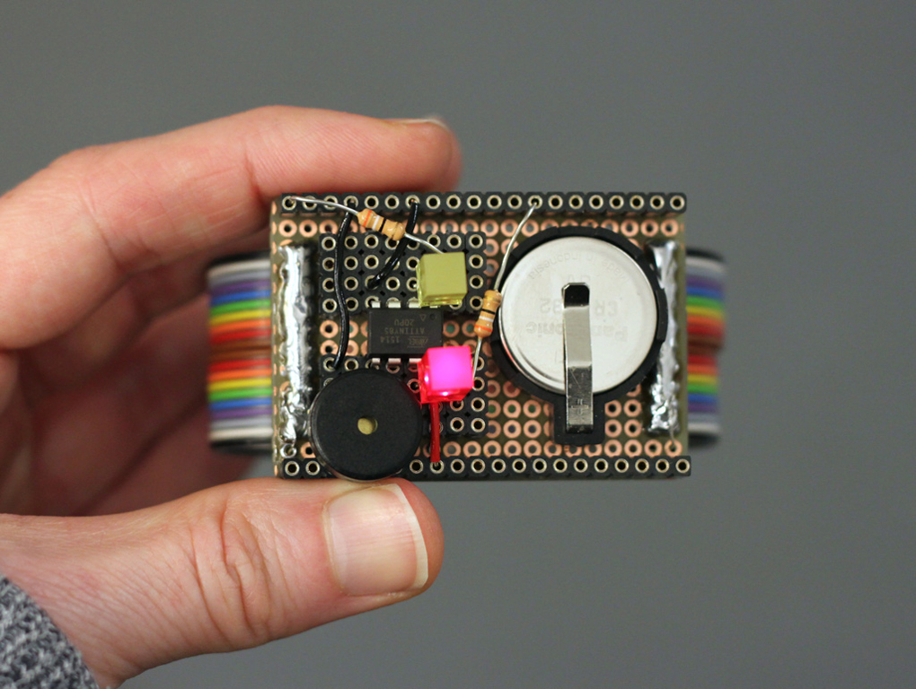 The edges of the perfboard piece were filed smooth in order to make the wearables more comfortable. / CC BY Kati Hyyppä