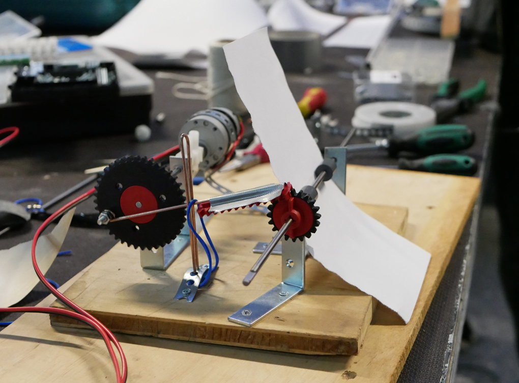 A paper rolling mechanism from a discarded printer was used in combination with a gear mechanism to move paper poetically up and down. / CC BY Kati Hyyppä
