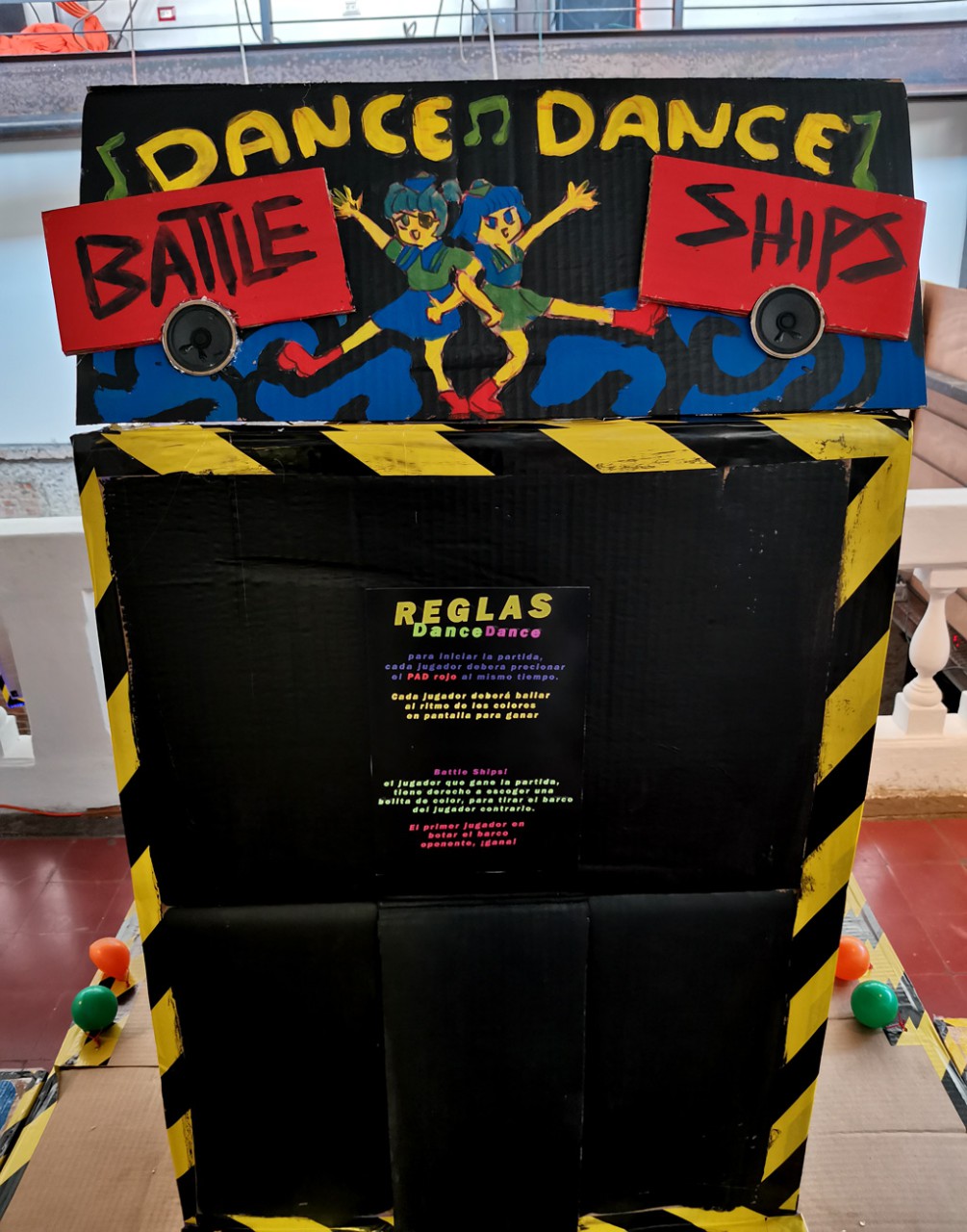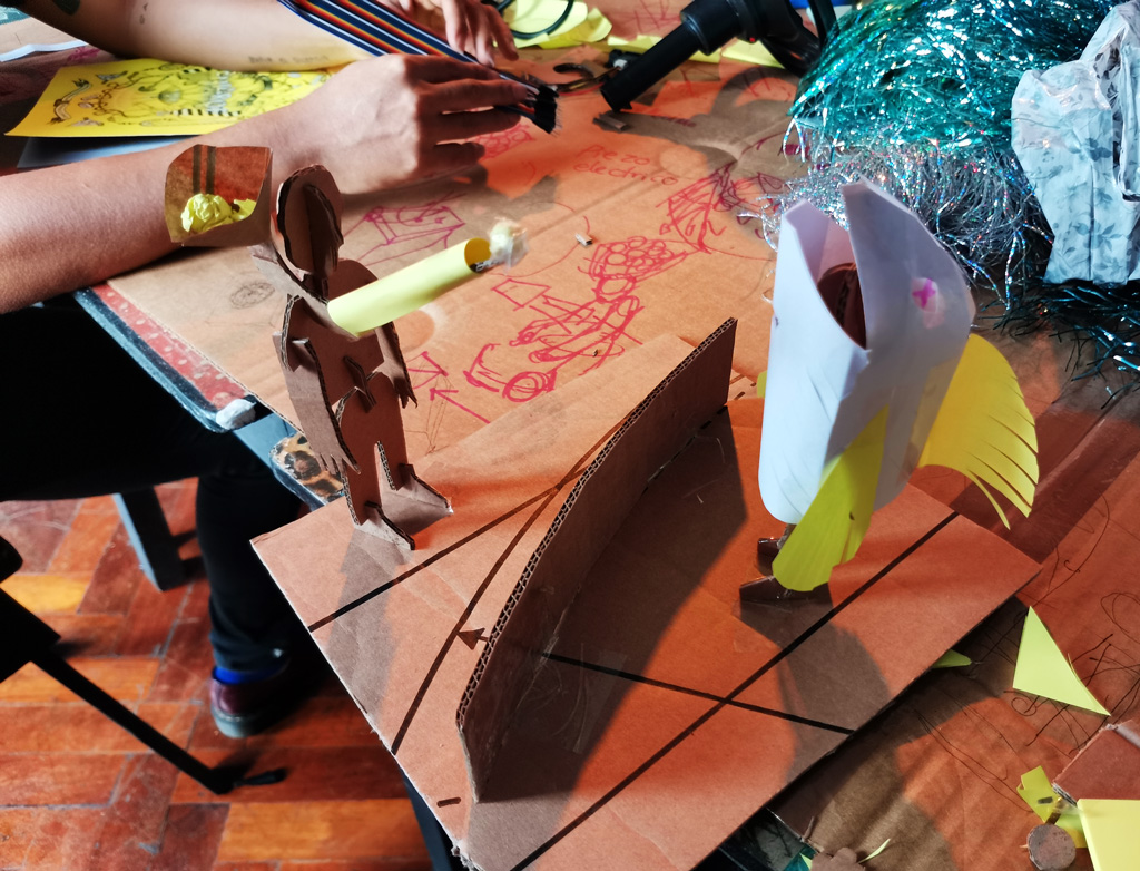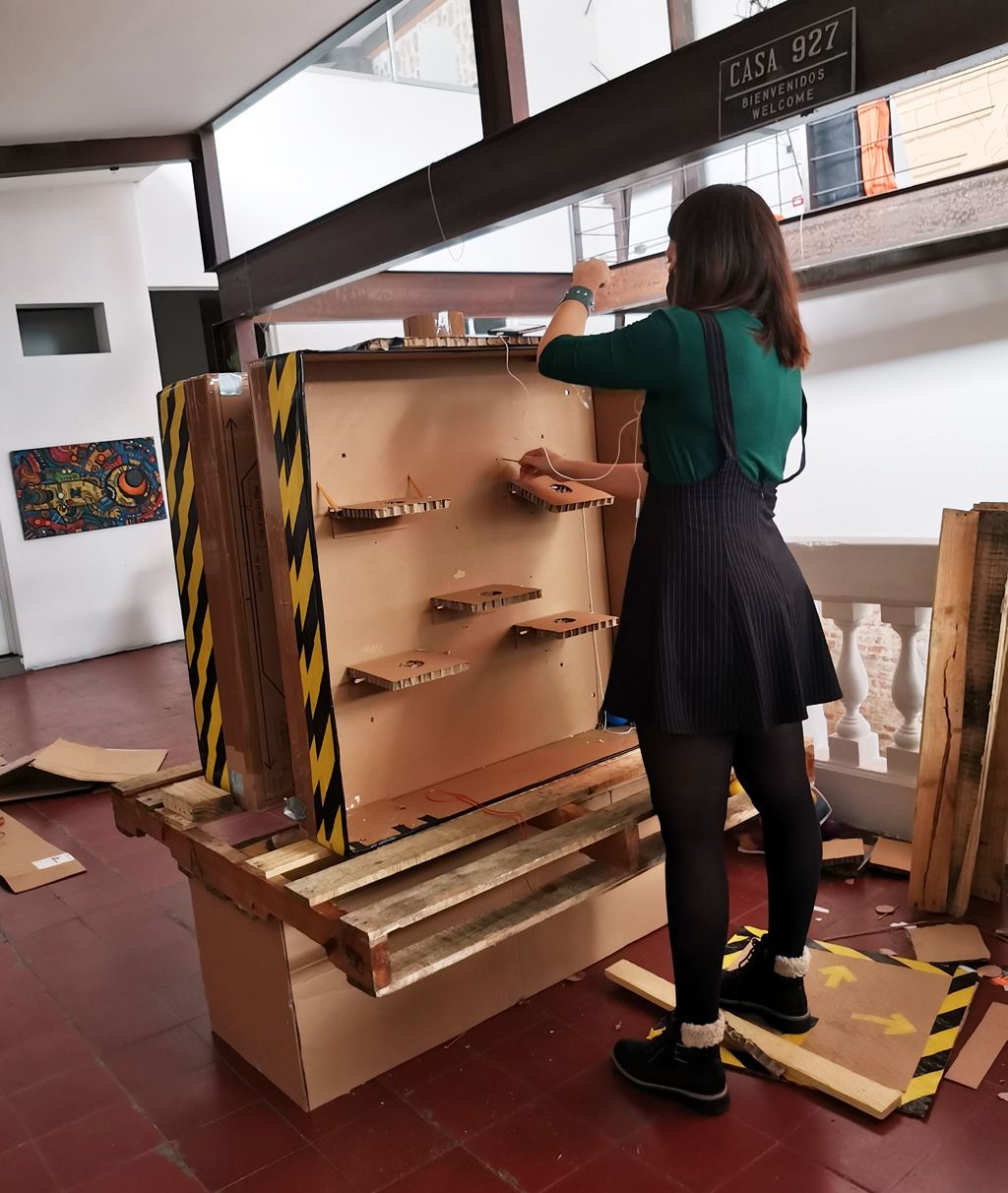 Here a game with a DIY dance mat and a ball dropping mechanism is being built. / CC BY Niklas Roy & Kati Hyyppä