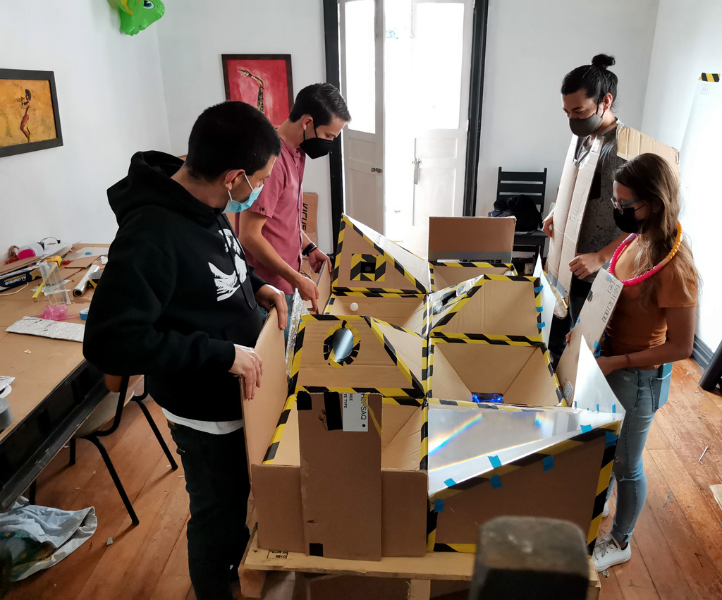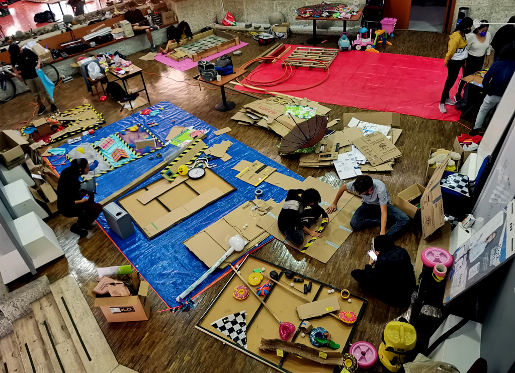 One team built an elaborate cardboard structure with PC ventilators that blow on ping pong balls. The player has to prevent the balls from flying out. / CC BY Niklas Roy & Kati Hyyppä