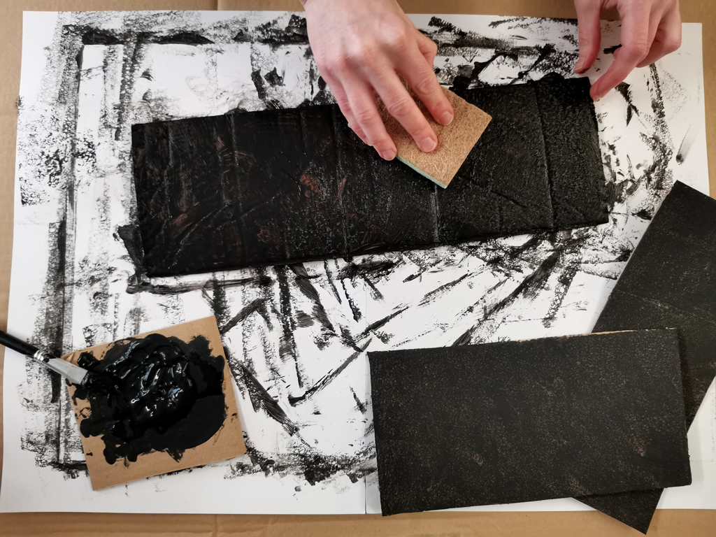 The cardboard was first painted with black kids' finger paint, as this was the biggest bottle of paint that I had. / Public domain