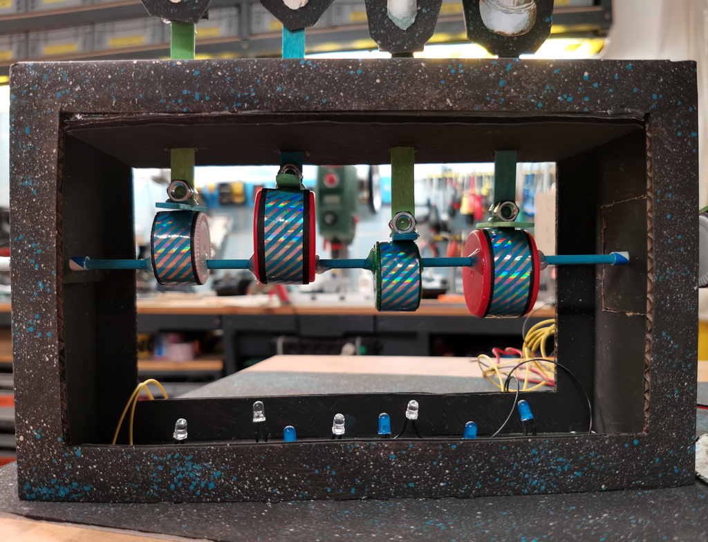 The circular motion drove a fungi carousel, which was surrounded by LEDs. / Public domain