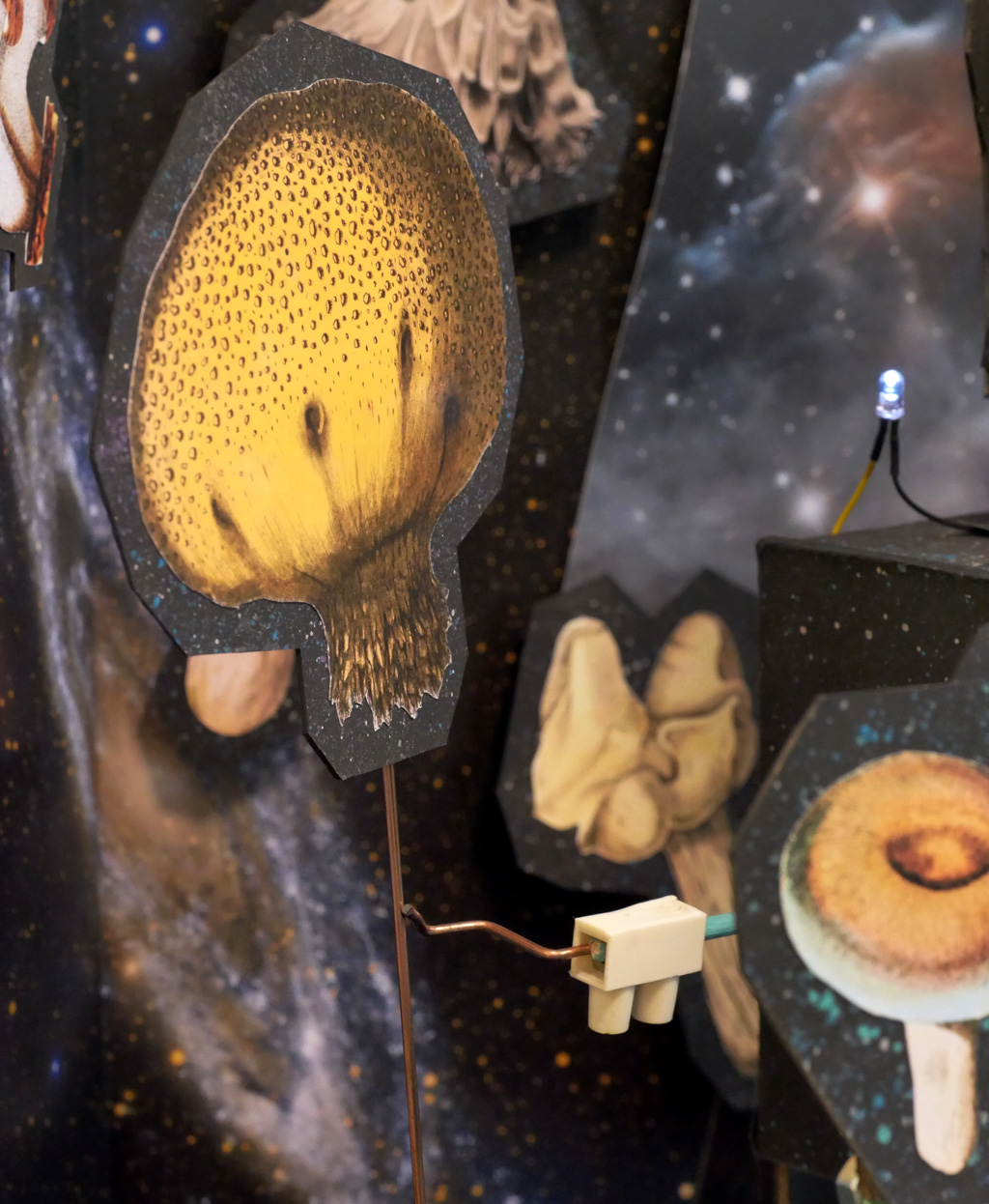 The fungi were cut out and glued on the space cardboard. / Public domain