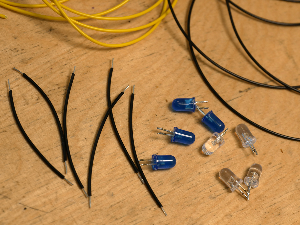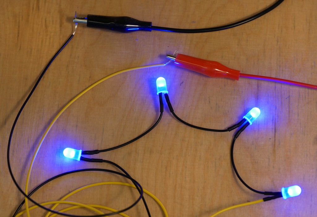 Regular blue and white LEDs were used. Four LEDs were connected in series for each LED chain. / Public domain