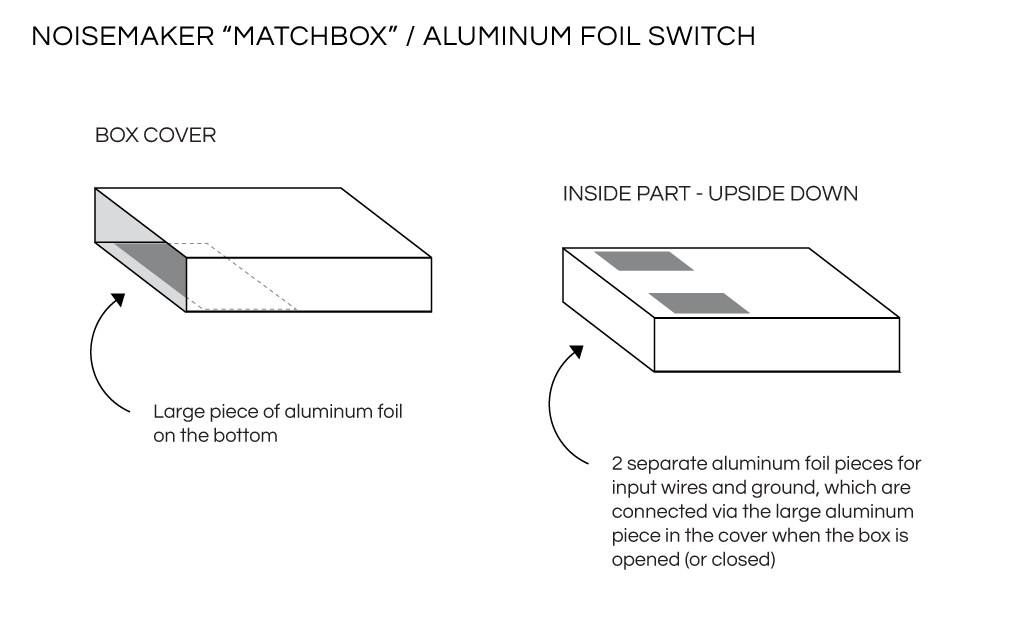 The aluminum foil switch mechanism for the noisemaker 'matchbox'. The cover of the box contains a large aluminum foil piece on the bottom. The inside part of the box has also in its outside bottom two separate aluminum foil contacts, one for the input wires and one for ground. When the box is closed, the large aluminum piece connects the two small ones, resulting in sounds. / CC BY Kati Hyyppä