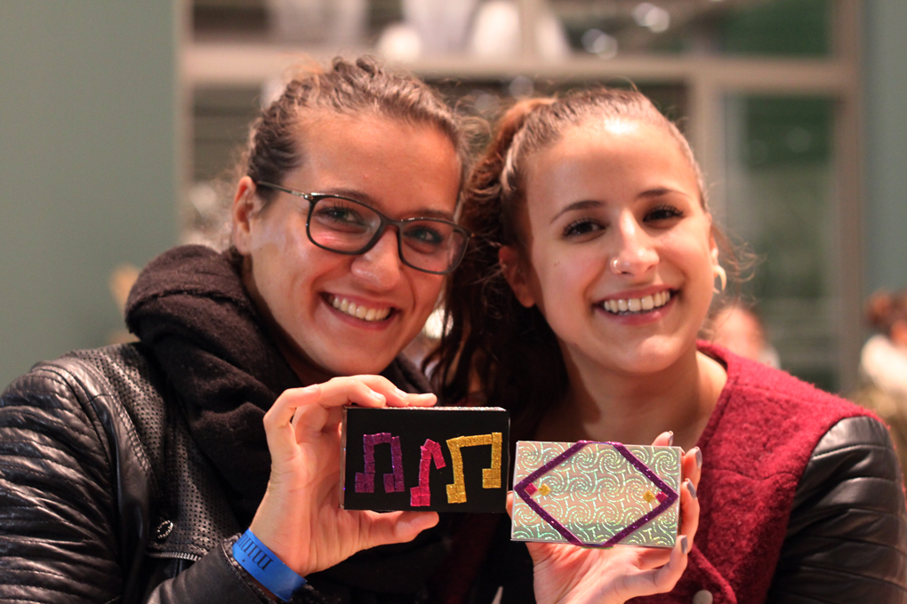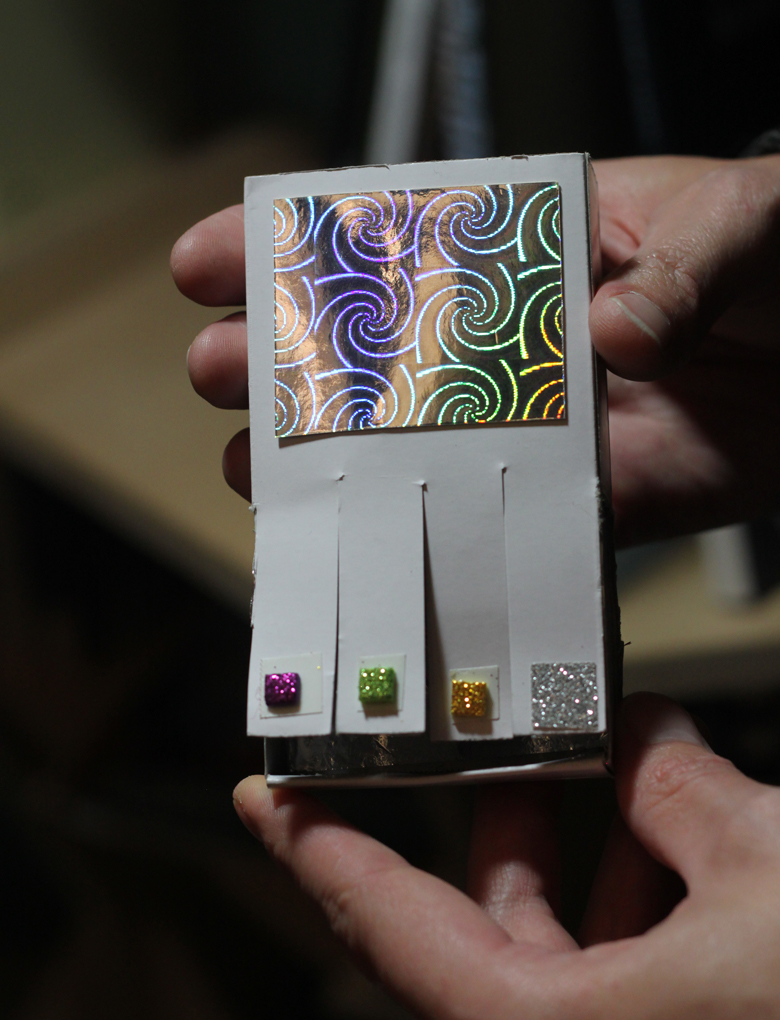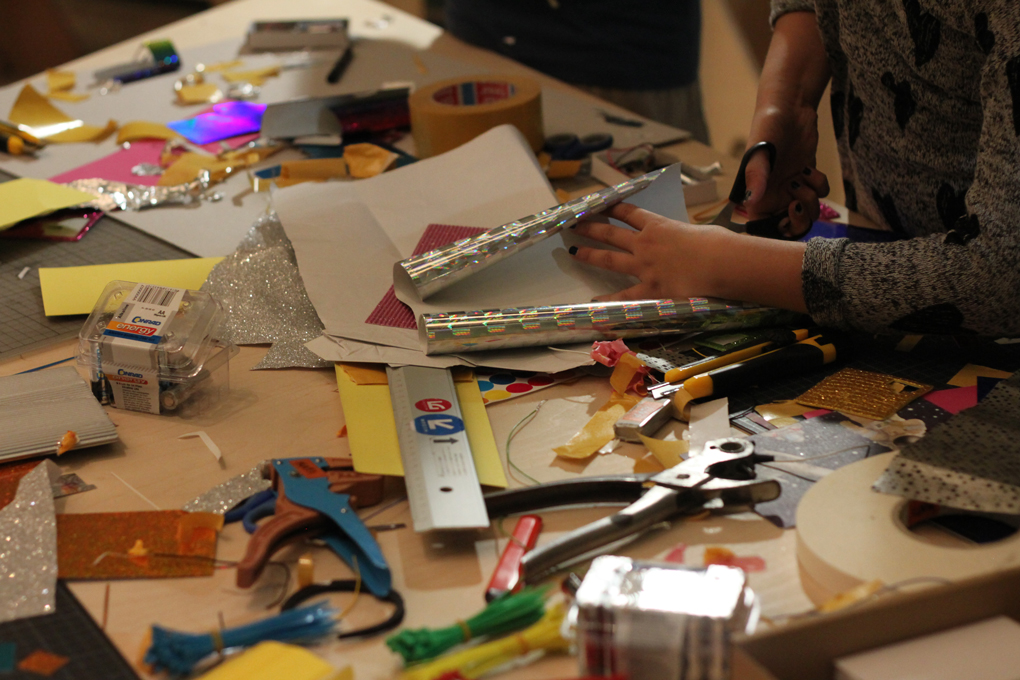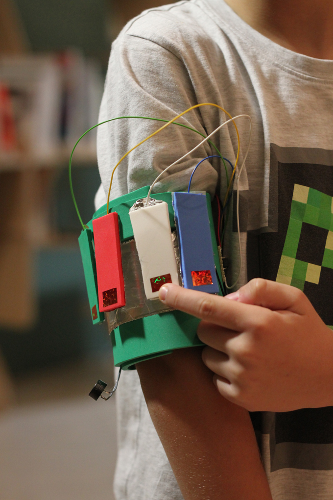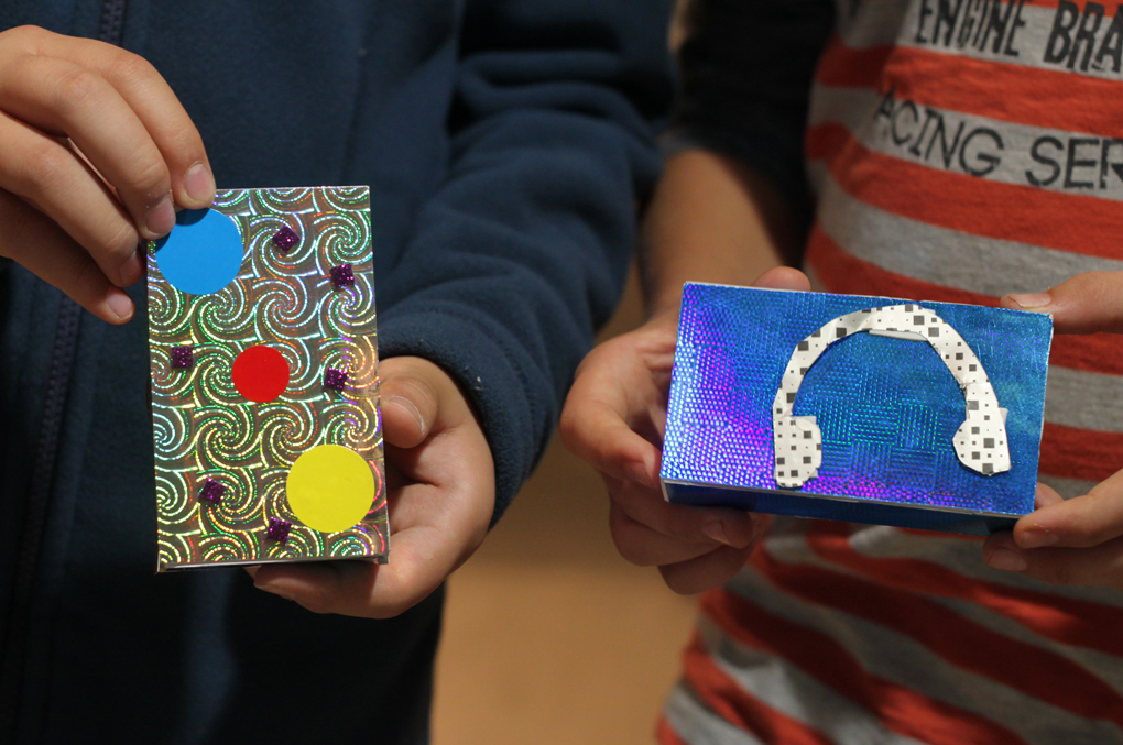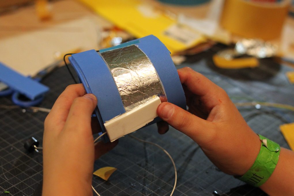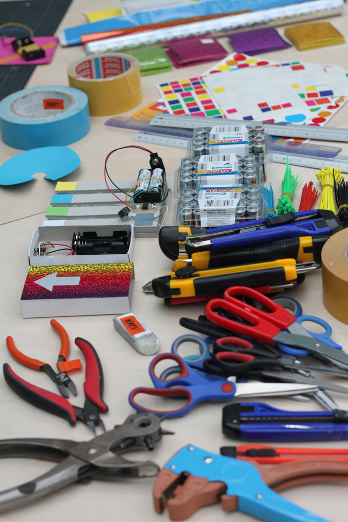 The participants' task was to create an interface for the noise-making electronics using various DIY materials, such as sturdy cardboard, small boxes, aluminum foil, double-sided tape and glitter foils. / CC BY Kati Hyyppä