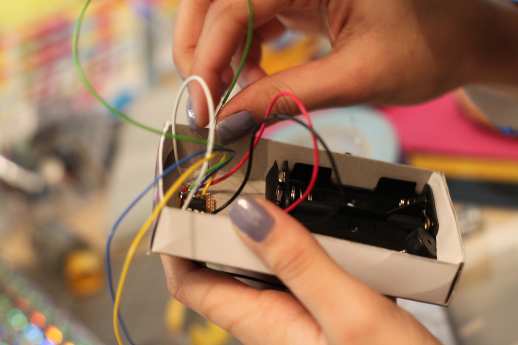 A noisemaker 'matchbox' in progress. Here the electronics are being attached inside the box. Two holes were made in the bottom so that the input and ground wires could be attached on the other side of the box piece in order to make a switching mechanism with aluminum foil. / CC BY Kati Hyyppä