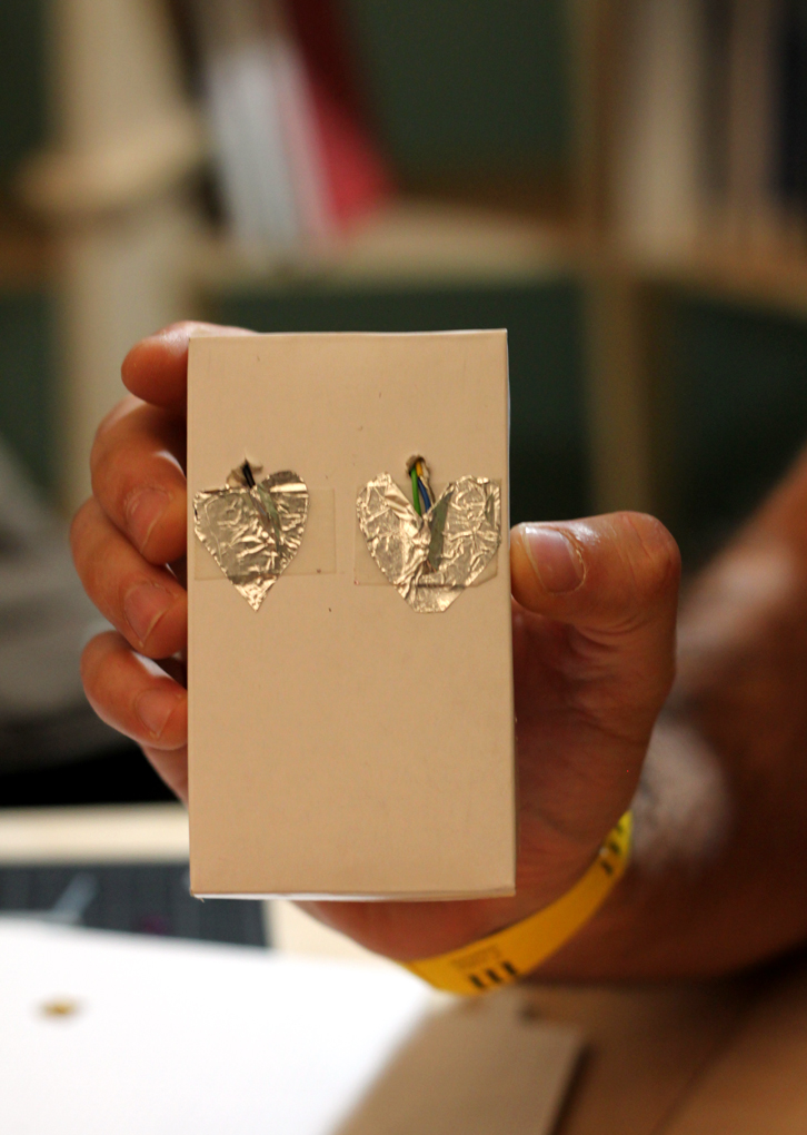 The Funky frequencies workshop focused on creating noise-making devices using pre-prepared electronics, cardboard, aluminum foil and other DIY materials. The style of the noisemakers was free, but one popular option was to make a little 'matchbox' which plays sounds when opened, such as the one in the photo. / CC BY Kati Hyyppä