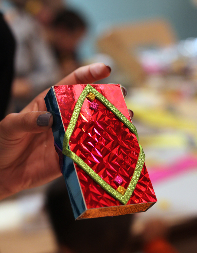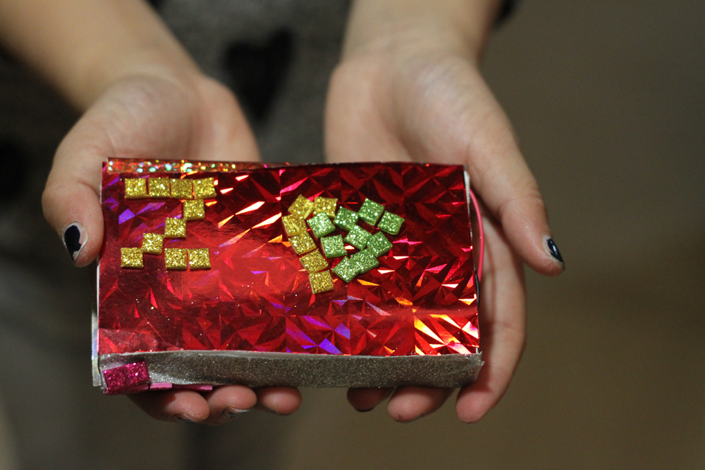 Another box inspired by the red glitter. Leftover parts of glitter stickers have also been reused creatively here. / CC BY Kati Hyyppä