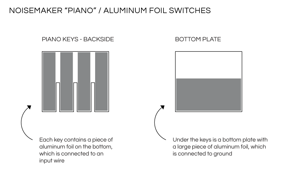 The aluminum foil switch mechanism for the noisemaker 'piano'. Each piano key contains a piece of aluminum foil on the bottom, which is connected to one input wire. Underneath the keys is a bottom plate with a large piece of aluminum foil. This piece is connected to ground. When a key is pressed, it touches the bottom plate and results in a sound, or a compound sound if multiple keys are pressed simultaneously. / CC BY Kati Hyyppä