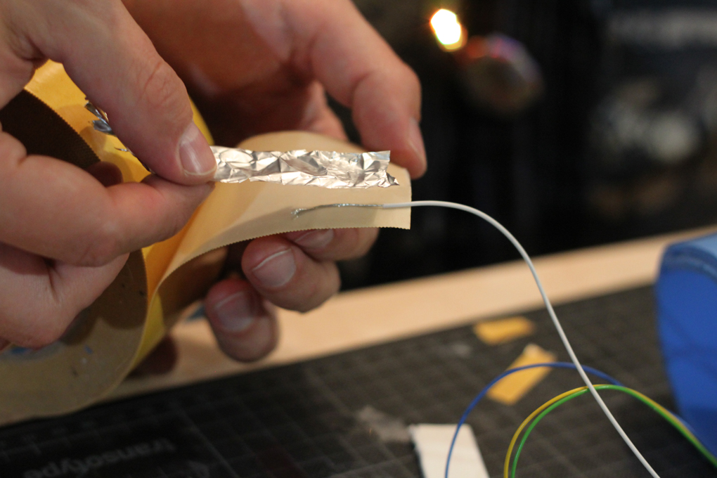 Connecting the input wires to aluminum foil with double-sided tape. / CC BY Kati Hyyppä