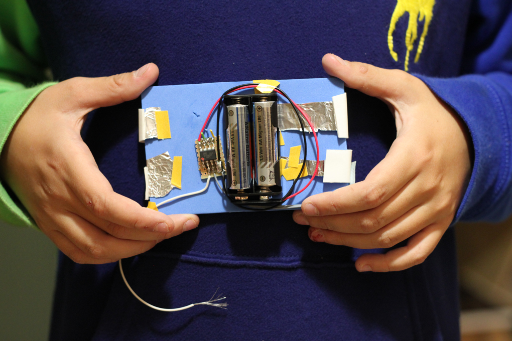 One participant also made a quiz device, which requested an answer to a challenging mathematical question. The answer was to be given by touching one of the options with the white wire. Correct answer resulted in playing a sound. Please note that the 'correct' answer in this case was actually '5', supposedly in order to make the quiz a bit harder. / CC BY Kati Hyyppä