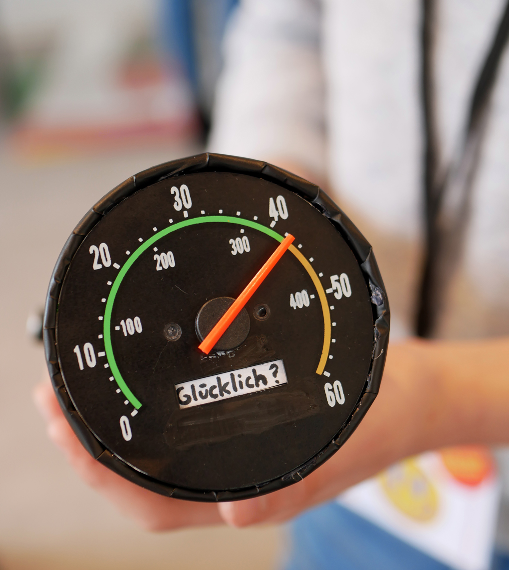 A happiness-meter made of a recycled speedometer measured the level of the headphone user's happiness. / CC BY Kati Hyyppä