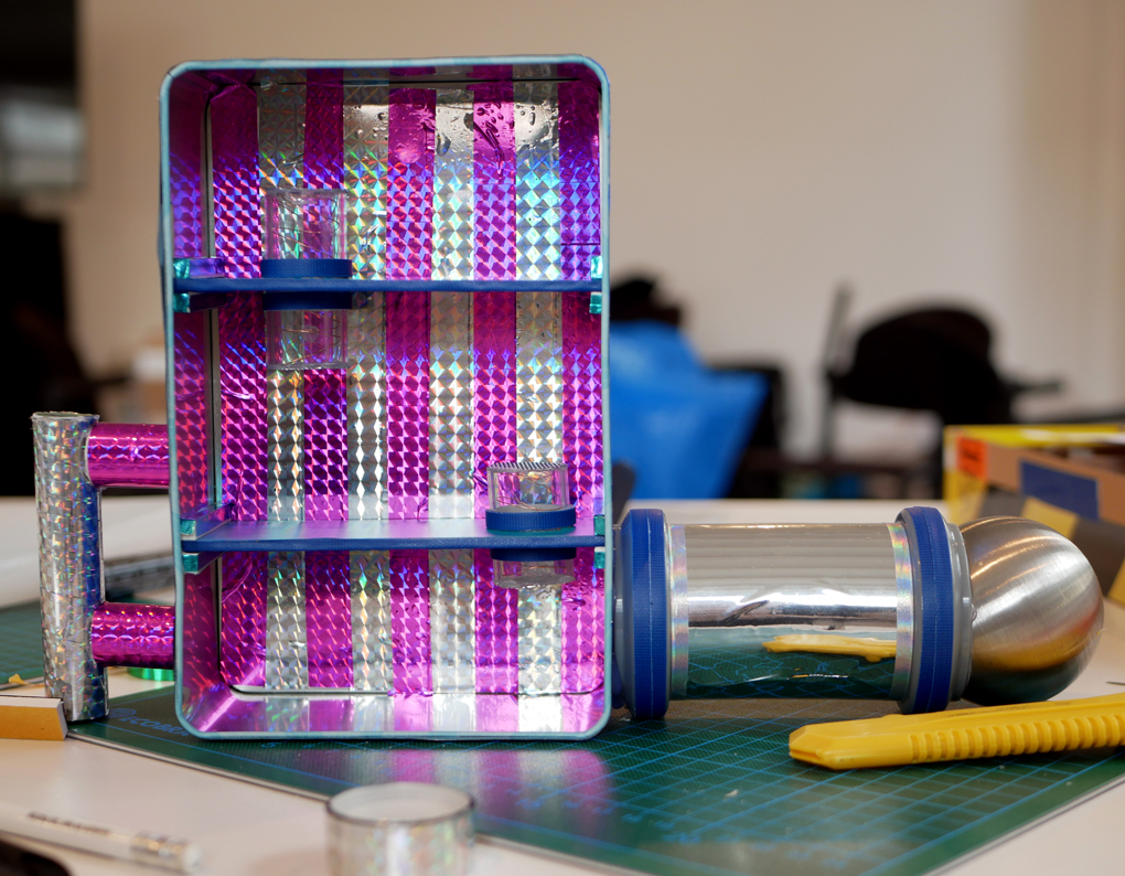 The 'Holiday mirror' box is being assembled. The idea is that you can stick your head inside in order to be fully immersed in your instant holiday experience. / CC BY Kati Hyyppä