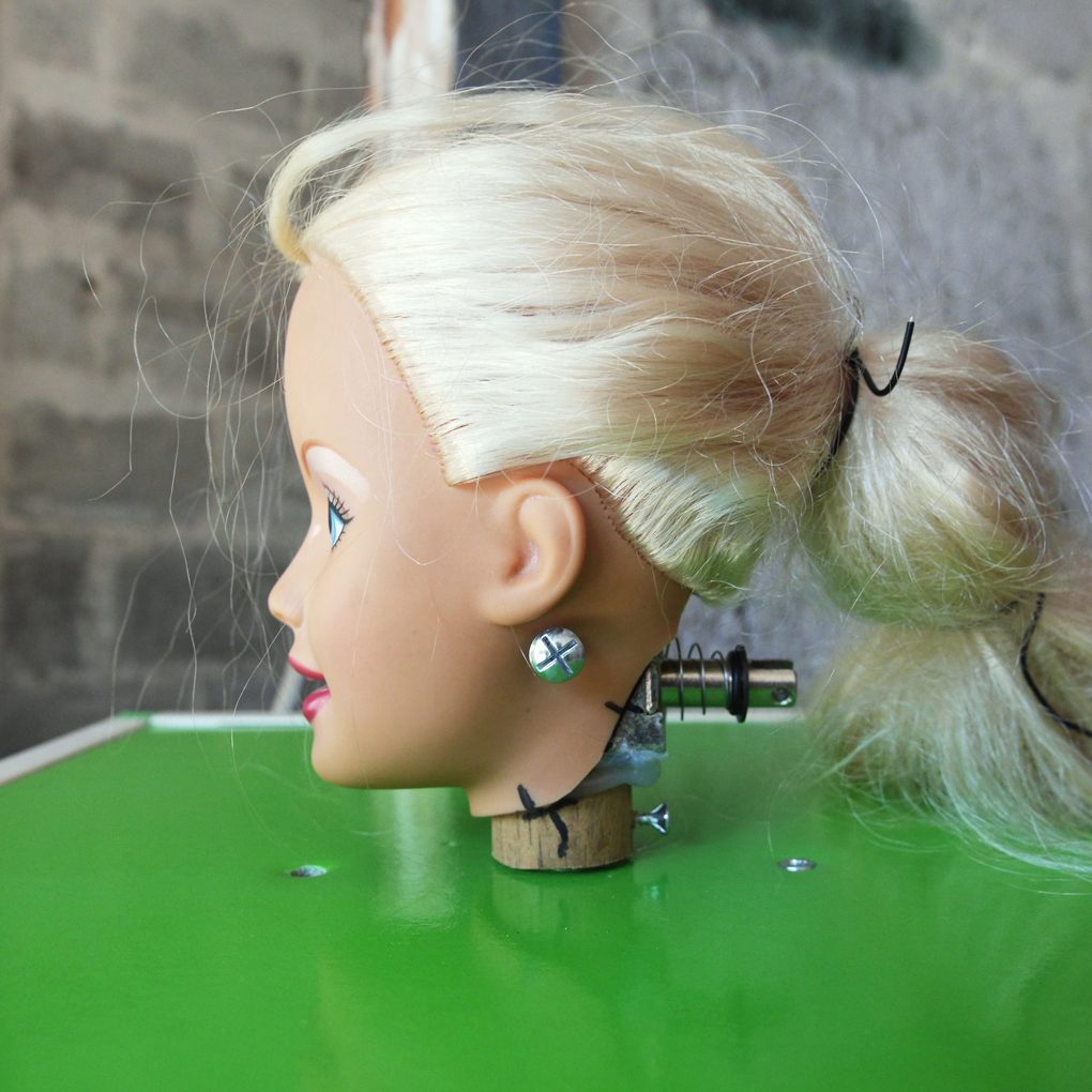 The joystick needed something interesting that it could control. This abandoned giant Barbie styling head from the thrift store toy section seemed perfect for that. / CC BY Kati Hyyppä & Niklas Roy