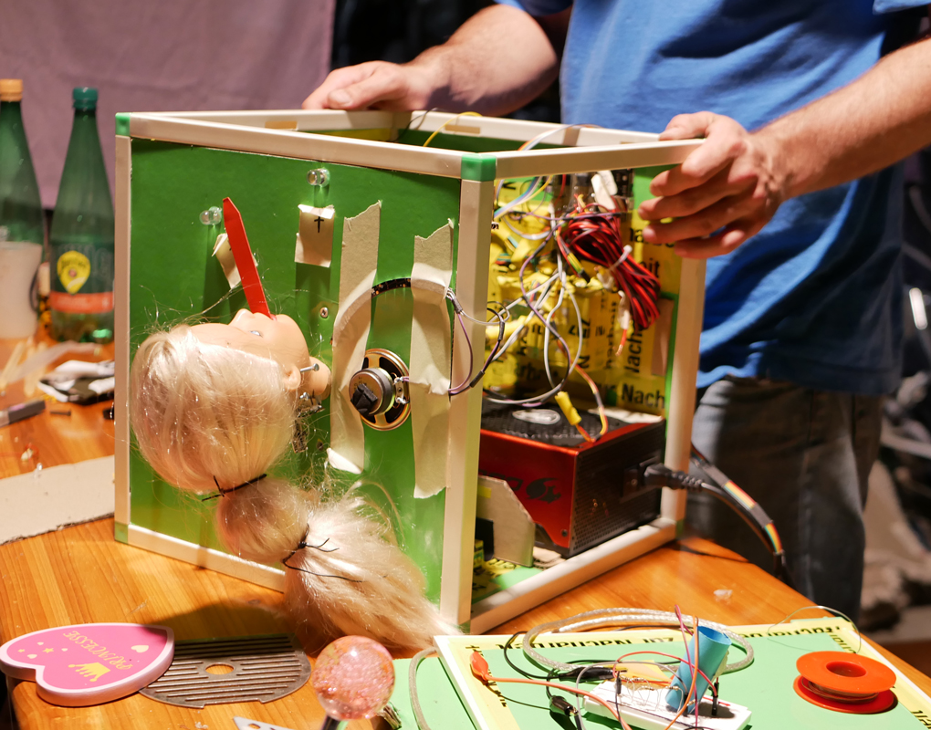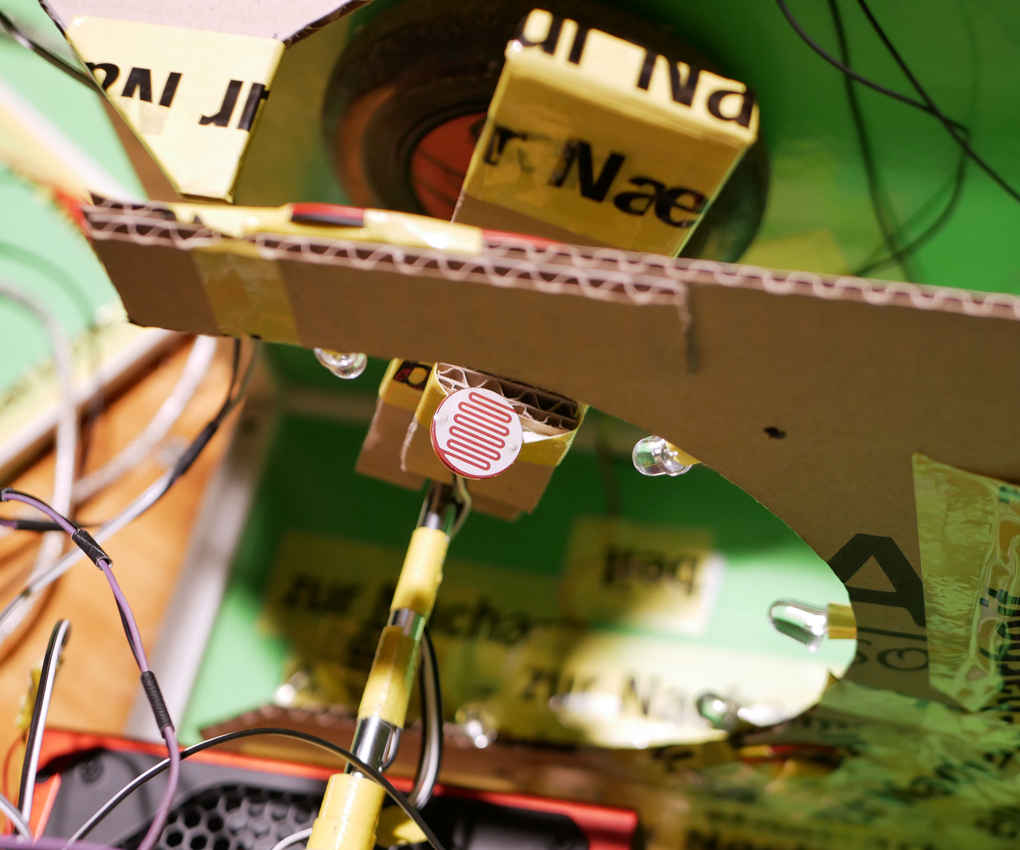 We needed a way to detect which sushi the Barbie had eaten. Photoresistor moving with the head and fixed-position LEDs hidden inside the box did the job. / CC BY Kati Hyyppä & Niklas Roy