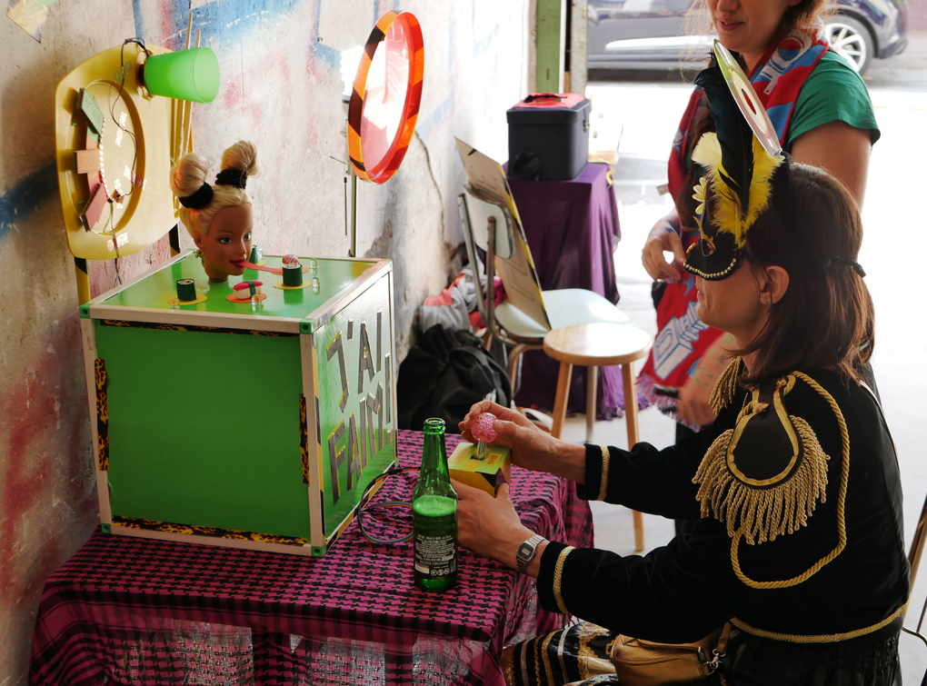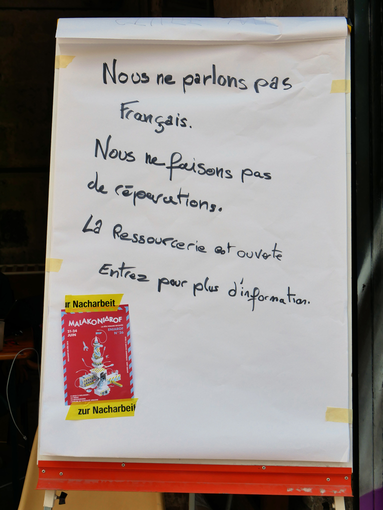 More and more electronics stuff had piled on our working tables and many passers-by asked us if we could repair their computers and other devices. Since our French was quite minimal, we asked a native speaker to write us this sign as an answer to the FAQ. / CC BY Kati Hyyppä & Niklas Roy