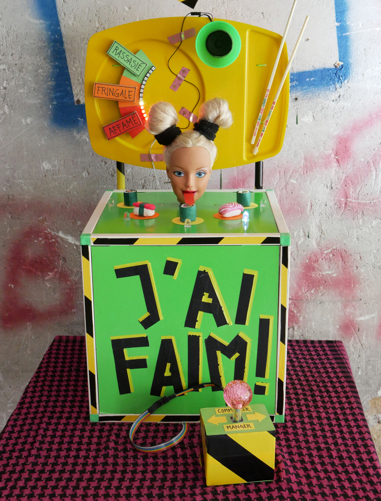 LED next to each sushi piece indicated which sushi should be eaten - eating a wrong sushi results in losing points. The tongue stuck out when eating. Barbie also got a 'space bun' hairdo (thanks for the term Darsha!) in order to avoid her voluminous hair getting stuck everywhere. / CC BY Kati Hyyppä & Niklas Roy