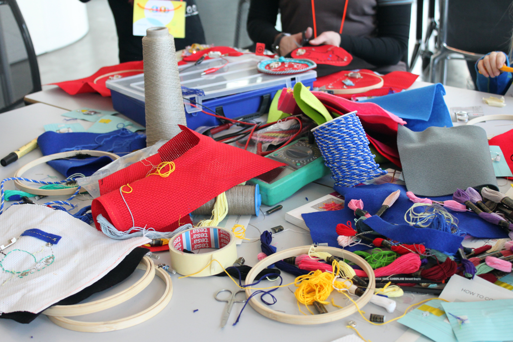 LED patch tools and ingredients including embroidery hoops, yarn and fabric, felt, conductive yarn and ribbons, all in a beautiful colorful chaos on the workshop table. -- CC BY / Kati Hyyppä