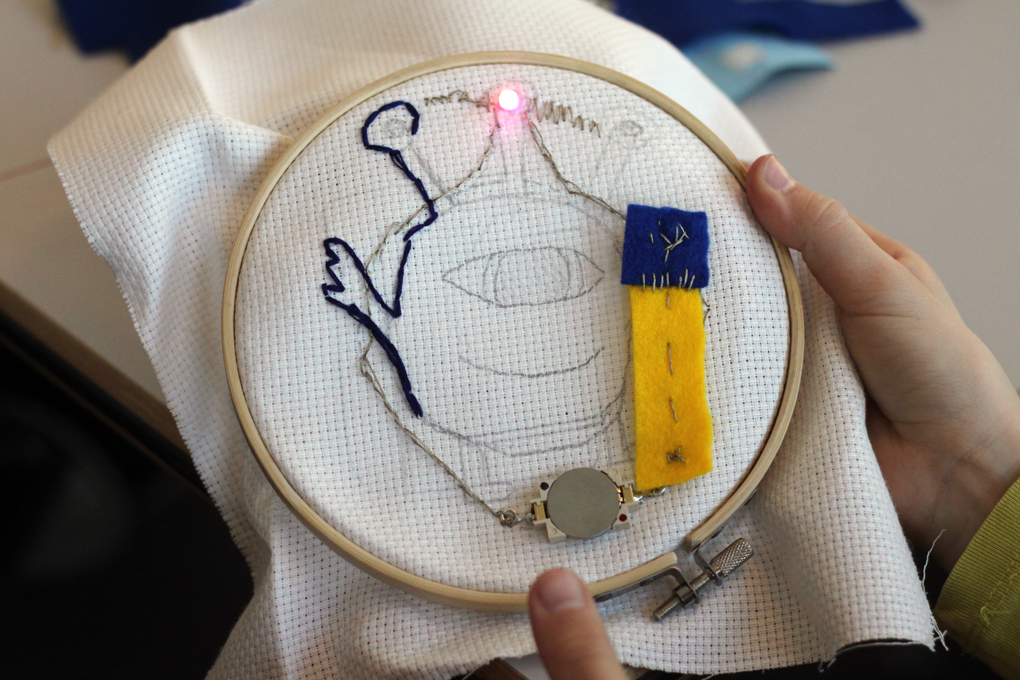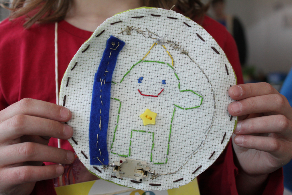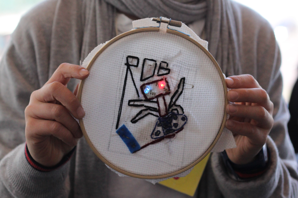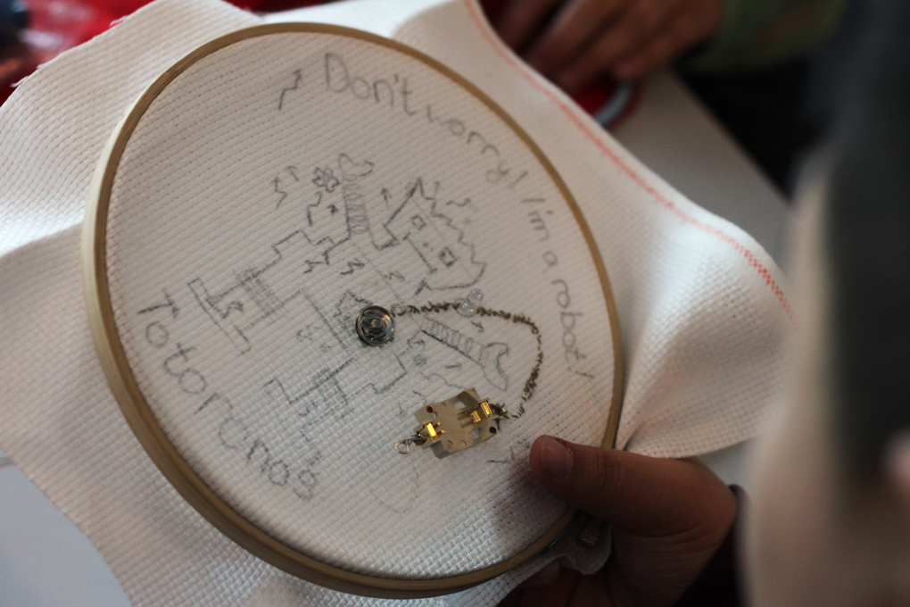 After the circuit was ready - and functioning - the next step was to embroider and decorate the pattern. Here's another robot friend. -- CC BY / Kati Hyyppä