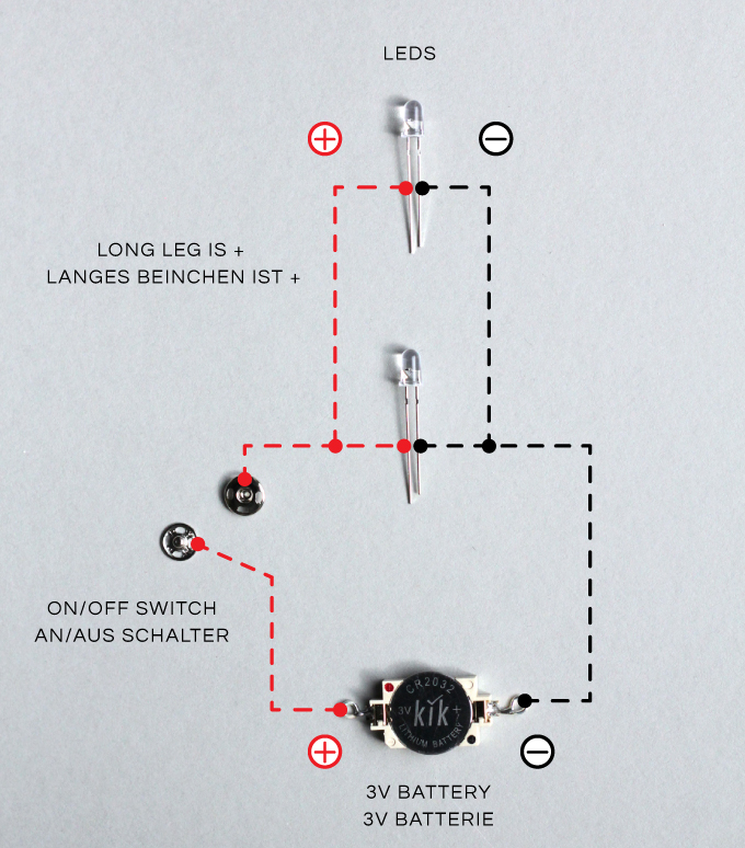 The LED circuit. One or two LEDs could be used, while most used one, as this was easier within the relatively short workshop duration. -- CC BY / Kati Hyyppä