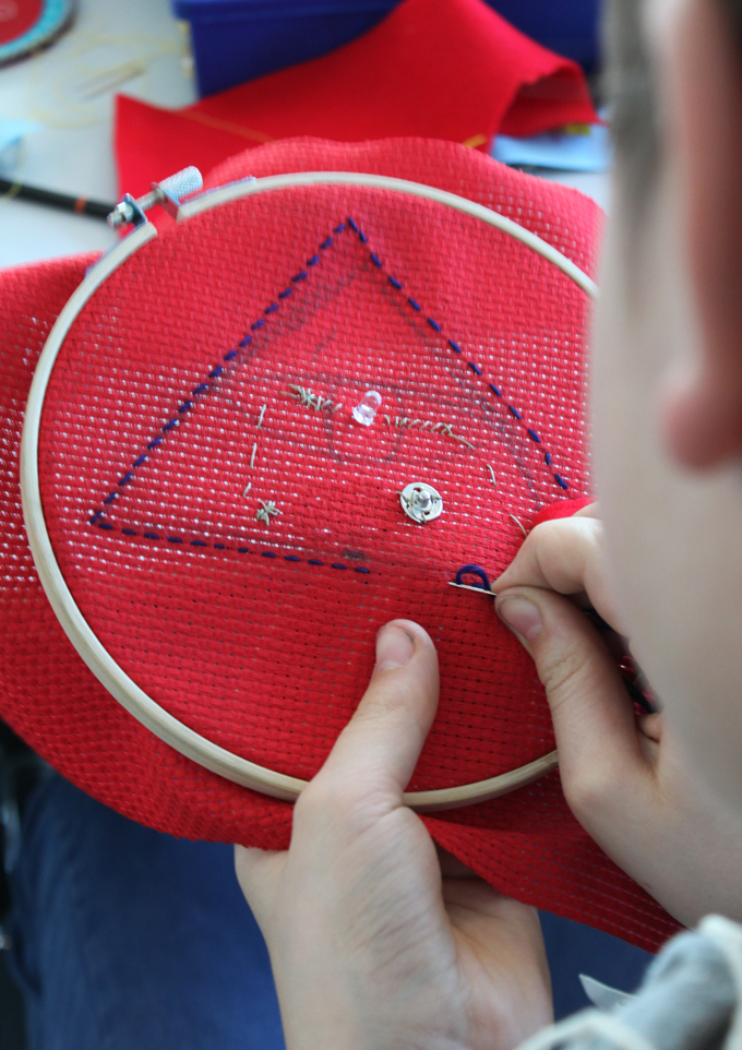 Patiently stitching... For some reason, the Illuminati symbol was also quite popular. -- CC BY / Kati Hyyppä