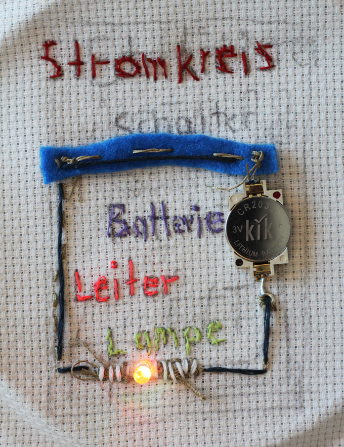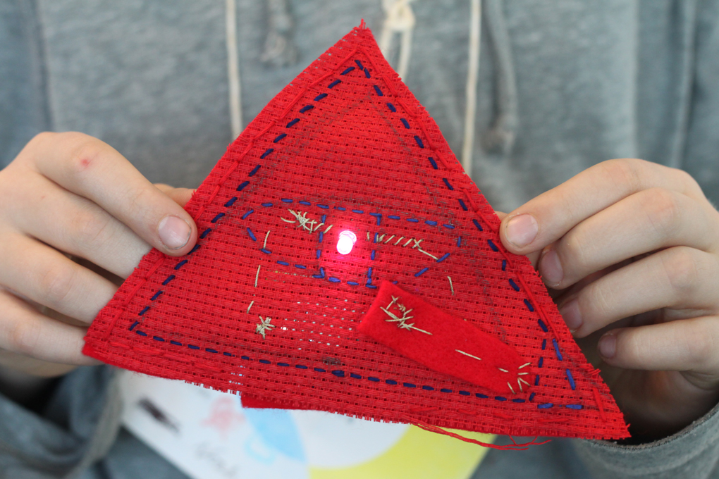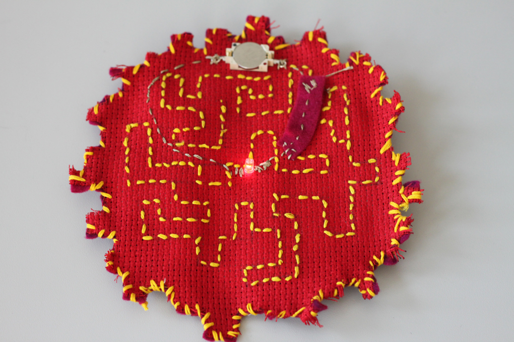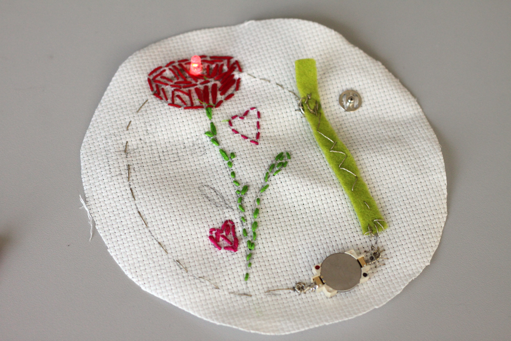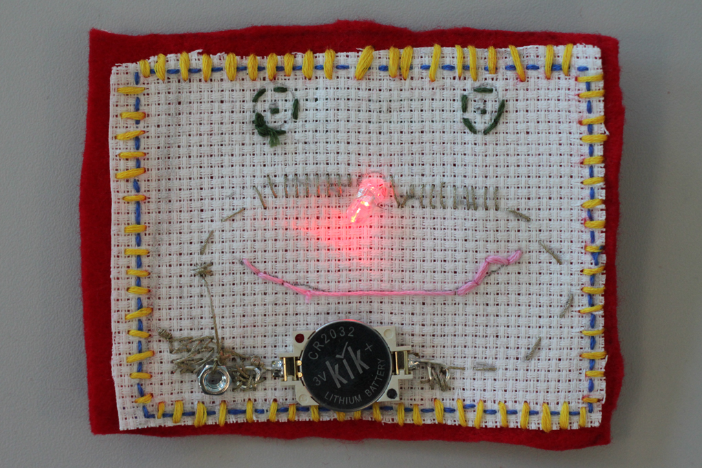The LED patches included a blinking LED, a 3V button cell battery, battery holder and an on/off switch, which most people made of a metal push button. Here's an 'alien sticking it's tongue out' according to the creator. -- CC BY / Kati Hyyppä
