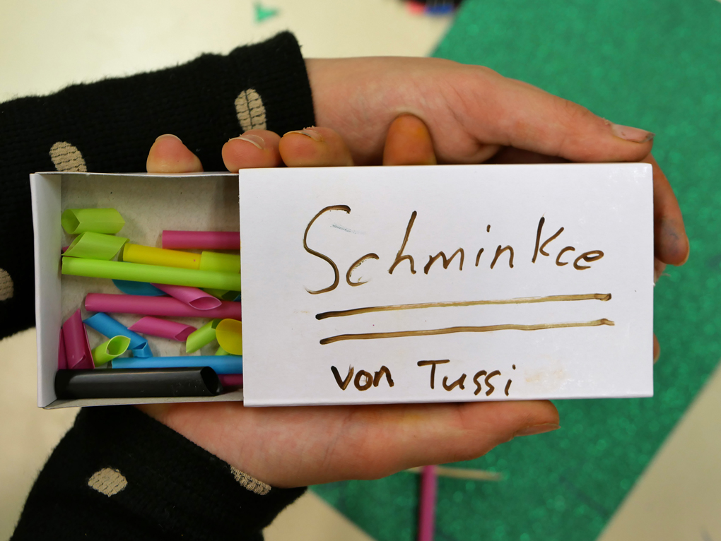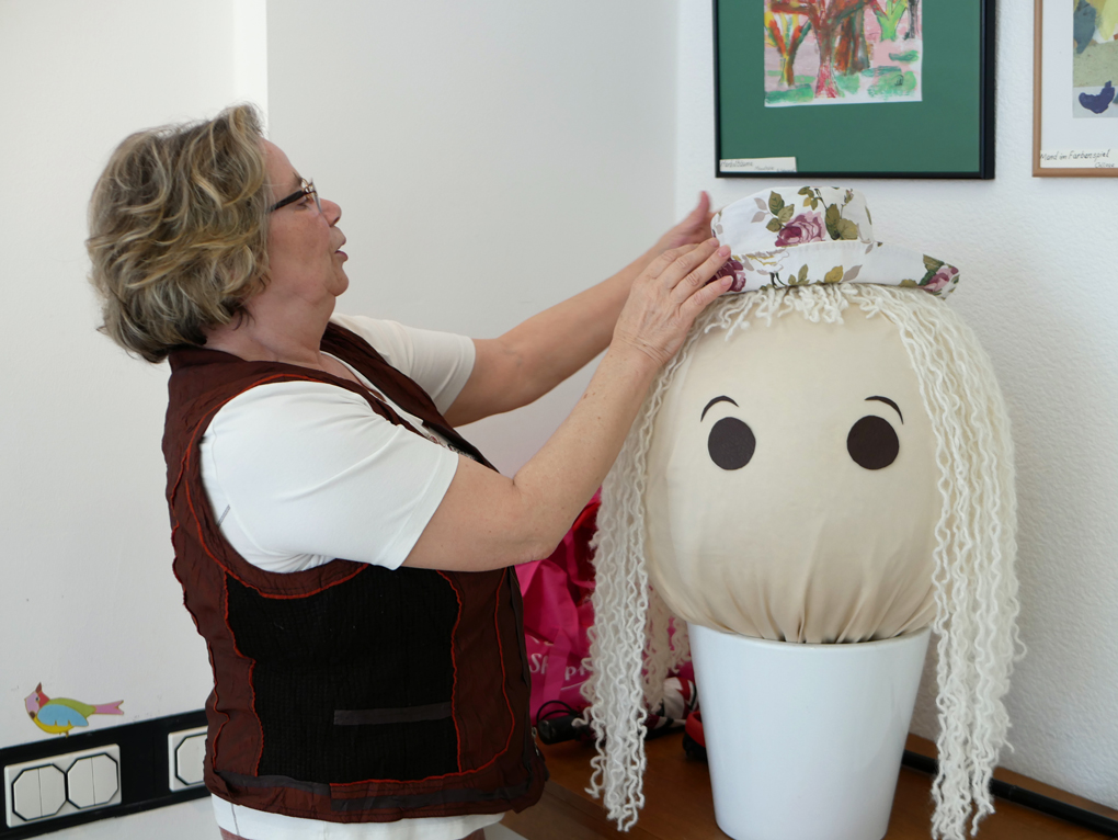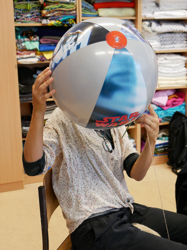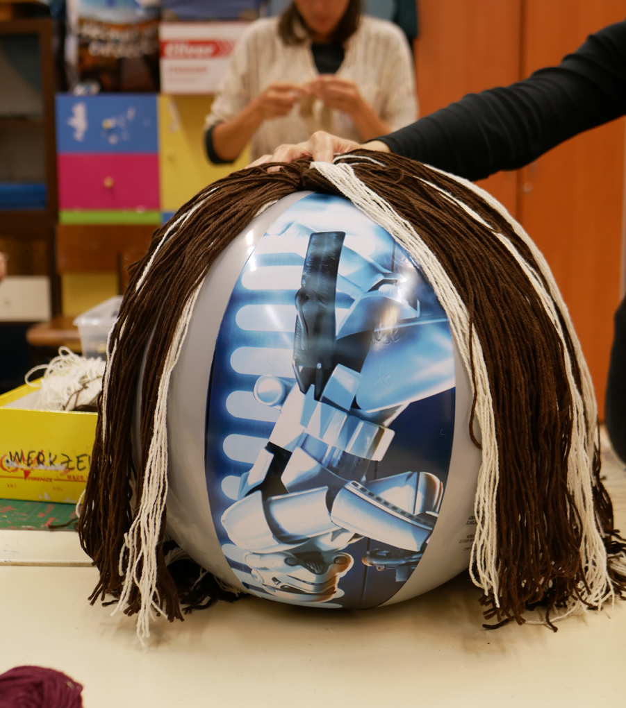 The balls were turned into heads. Here the hairstyle of Louisa is being planned at our group in the refugee home. / CC BY Kati Hyyppä