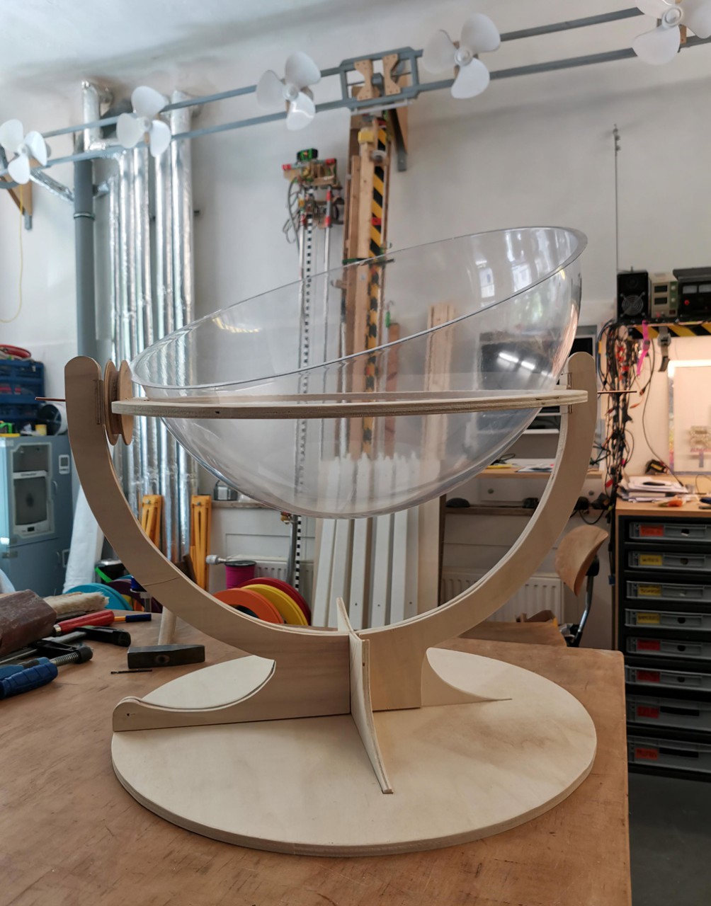 We thought it would be fun to spread all the balls across the play field in the beginning of the game. For this purpose, a giant ice cream bowl with a tipping mechanism was built. / CC BY Niklas Roy & Kati Hyyppä