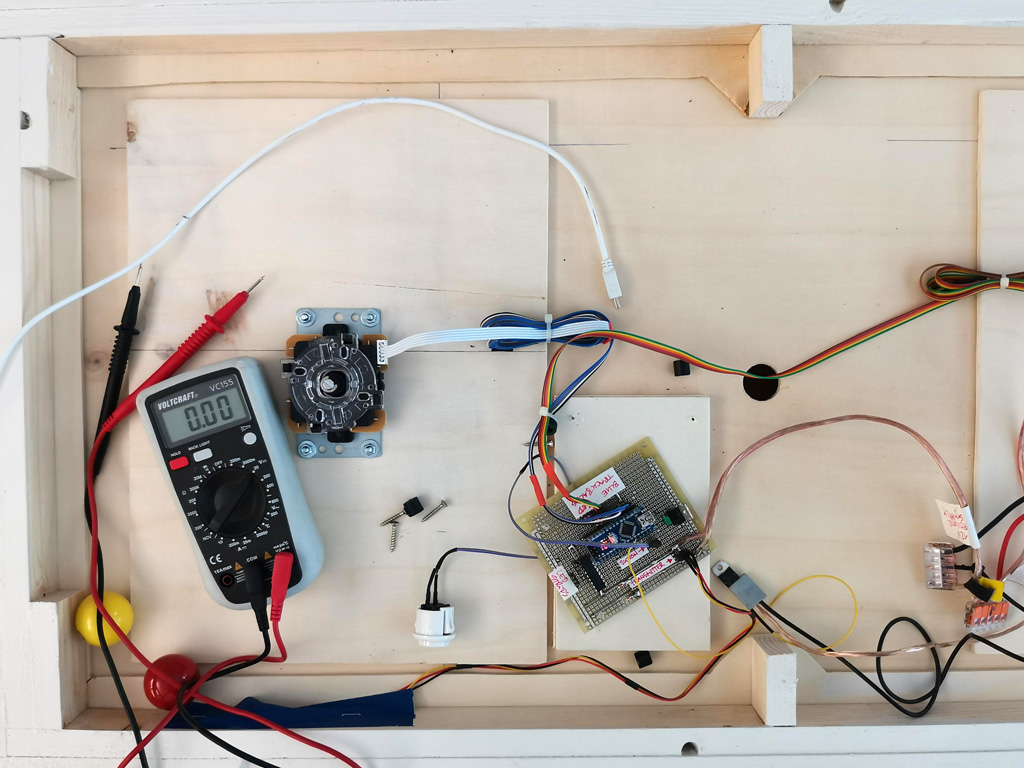 The backside of the joystick board including a circuit board with an Arduino microcontroller, a start button and the 433MHz transmitter module for remote controlling the vehicles. / CC BY Niklas Roy & Kati Hyyppä