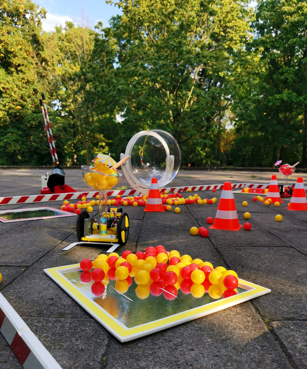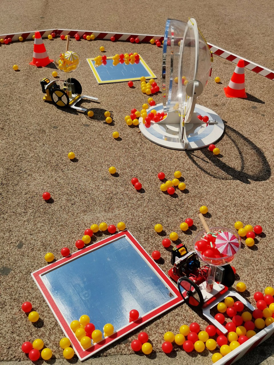 The goal of the game is to collect as many as possible balls on a tray. The yellow tray is for the yellow 'banana' vehicle and the red one for the red 'cherry' vehicle. The color of the balls doesn't matter - otherwise the game is very challenging, but players can also develop their own rules. / CC BY Niklas Roy & Kati Hyyppä