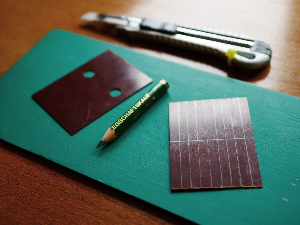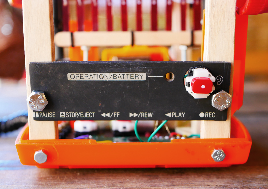 The front and back of the loom needed still some styling, so I cut out few 'panels' from an old cassette player. / CC BY Kati Hyyppä