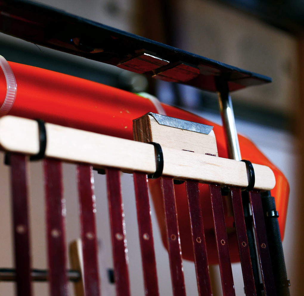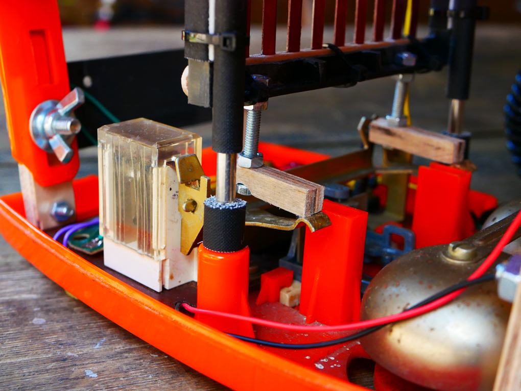 And here is the finished switch. A metal-covered block is attached to the shaft. As the shaft is lifted up, the block connects two smaller metal pieces on the top part of the loom, triggering a sound. / CC BY Kati Hyyppä