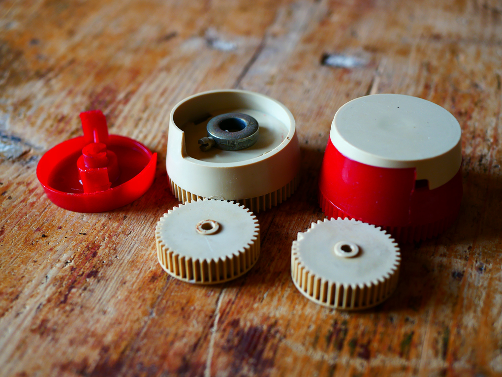 The winding mechanism needed a ratchet in order to prevent the warp getting loose. The small plastic parts that move as the receiver is lifted were repurposed for the ratchet mechanism. / CC BY Kati Hyyppä