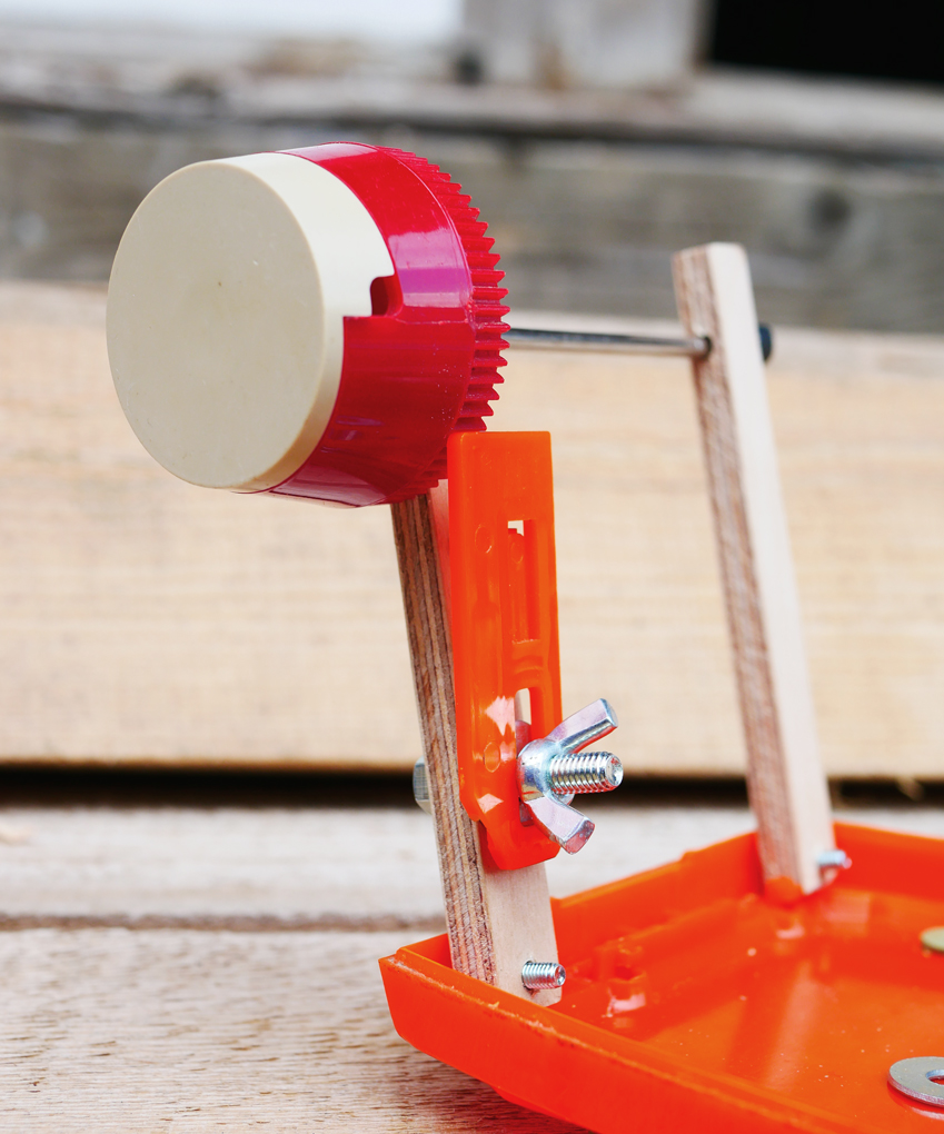 When weaving progresses, one needs to be able to wind the warp yarn. Vintage rotary knobs, which probably used to be for controlling volume, were ideal for a winding mechanism. / CC BY Kati Hyyppä