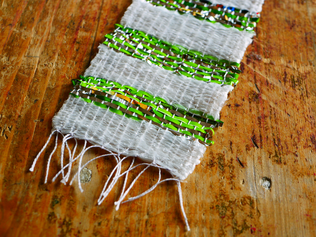 In a post-apocalyptic spirit I used trash as weaving material, such as these colorful 'smart snacks' bags that were left over from the tinkering evenings. / CC BY Kati Hyyppä
