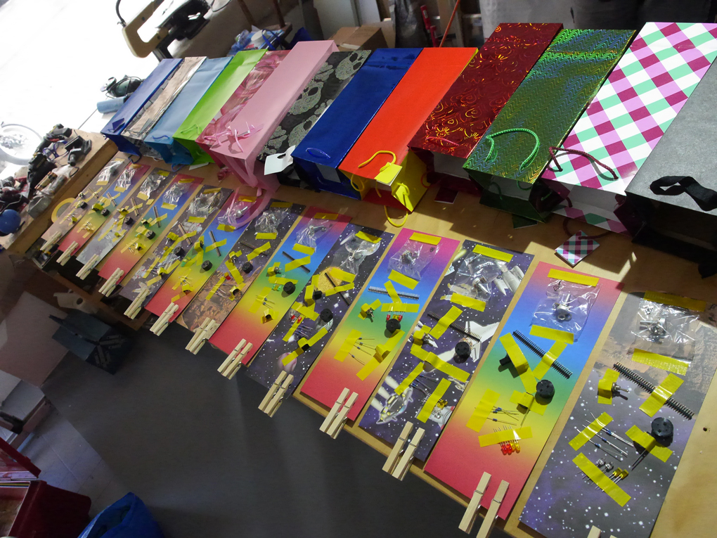 Colorful gift bags with three RC servos and other goodies were prepared for the participants in order to ensure a happy start for the workshop -- CC BY / Niklas Roy & Kati Hyyppä